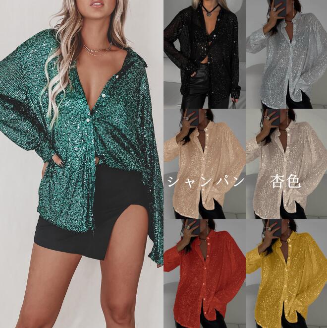 スパンコールシャツ レディース 長袖 レディースファッション 超目玉商品 ブラック ホワイト グリーン シャンパン 杏色 レッド ゴールド S M L XL XXL 3XL
