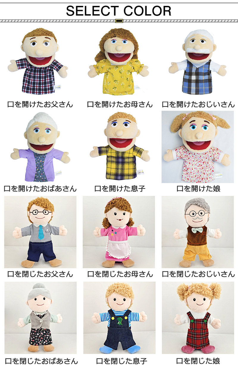 ハンドパペット ぬいぐるみ 開口 家族 おもちゃ ぬいぐるみ 新作 口を開けたお父さん 口を開けたお母さん 口を開けたおじいさん 口を開けたおばあさん 口を開けた息子 口を開けた娘 口を閉じたお父さん 口を閉じたお母さん 口を閉じたおじいさん 口を閉じたおばあさん 口を閉じた息子 口を閉じた娘