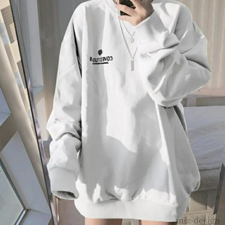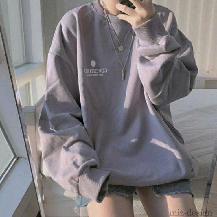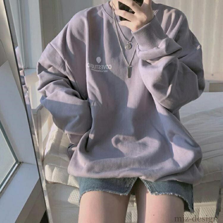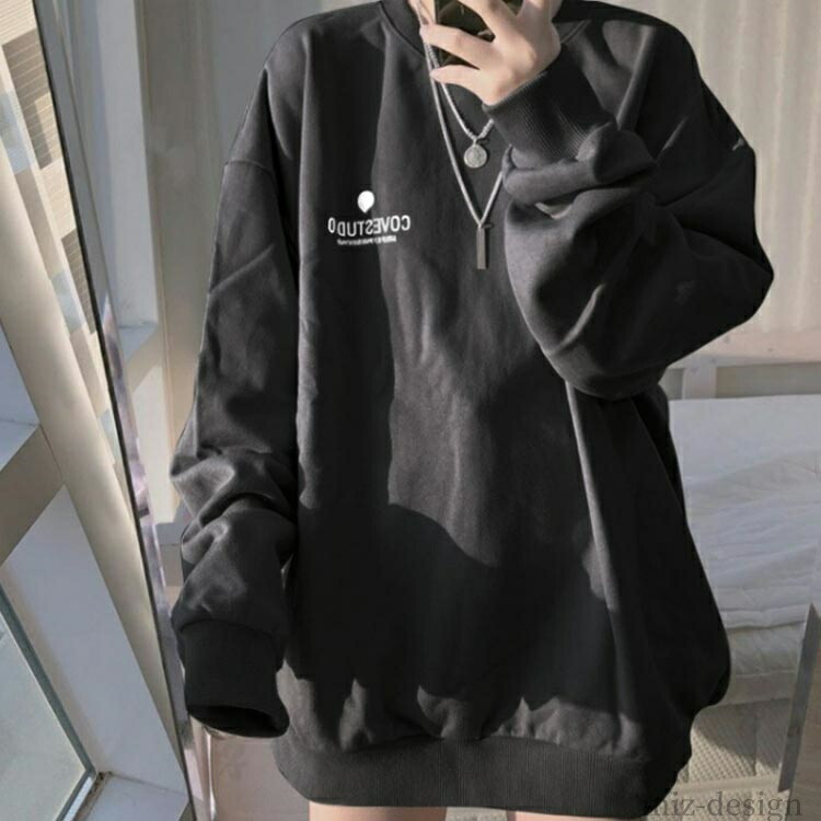 ロング丈 クルーネック お洒落 大きい トップス パーカー 新作 ブラック パープル ホワイト M L XL 2XL