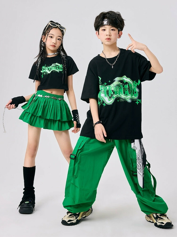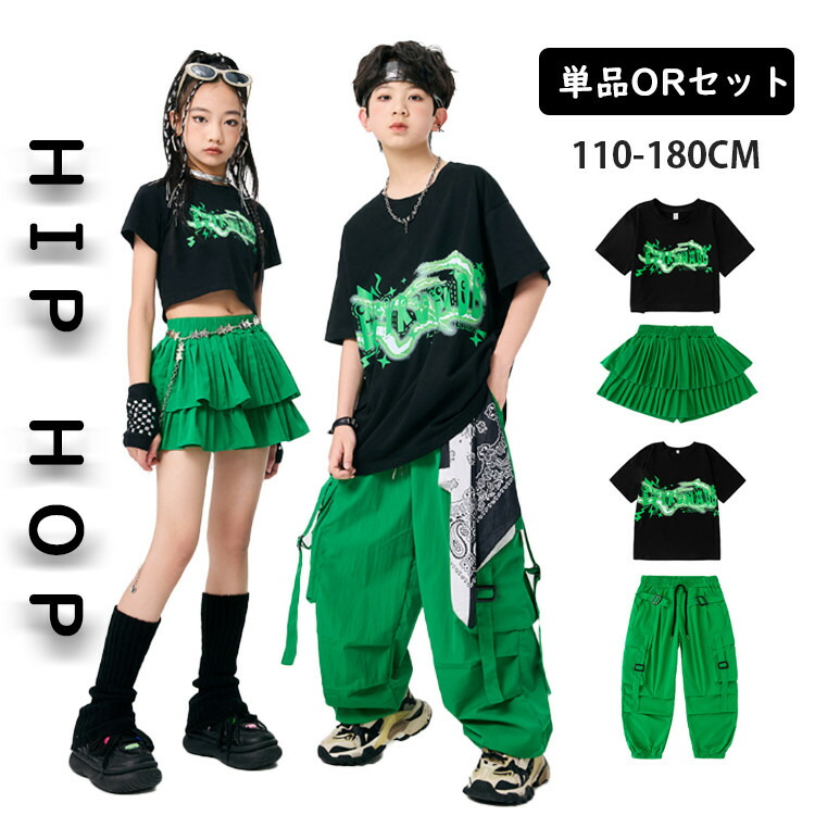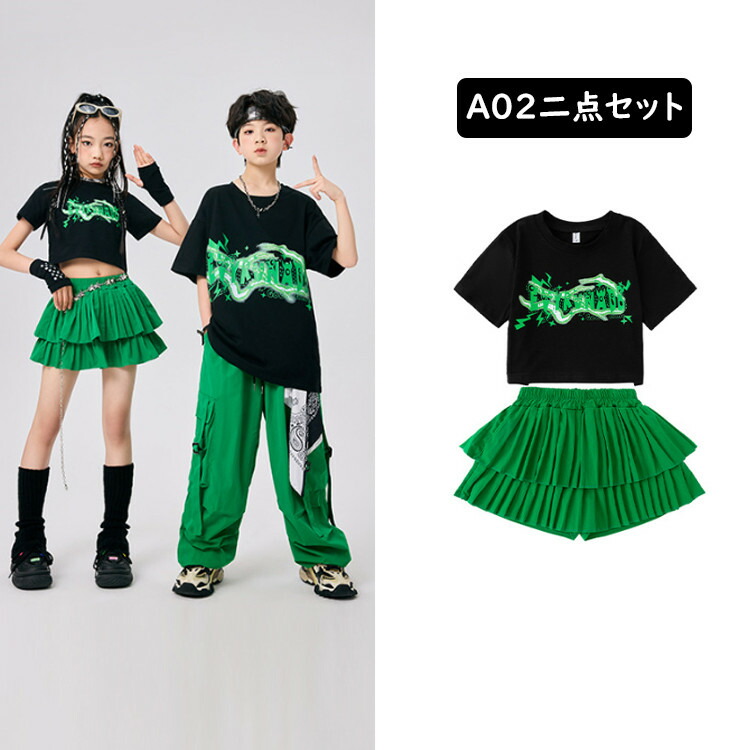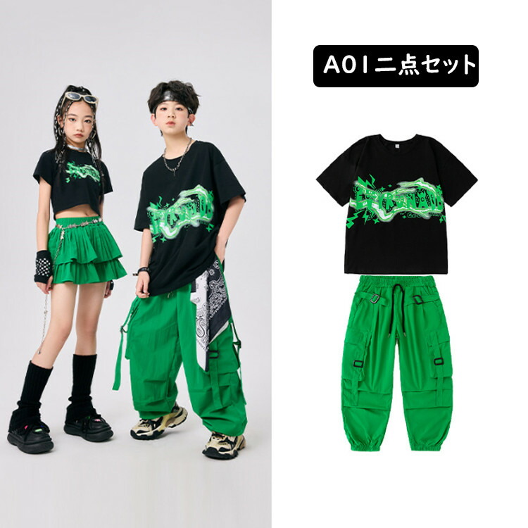 ダンス衣装 緑 半袖 へそ出し トップ キッズ ベビー マタニティ 新登場! 女の子Tシャツのみ 男の子Tシャツのみ スカートのみ ズボンのみ A01二点セット A02二点セット A03三点セット 110 120 130 140 150 160 170 180