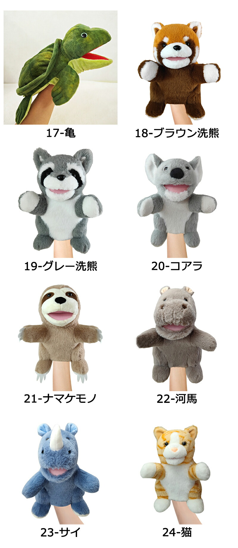 ハンドパペット ぬいぐるみ 開口 口が おもちゃ ゲーム 新作 1-ライオン 2-虎 3-象 4-猿 5-麒麟 6-豹 7-乳牛 8-鴨 9-豚 10-犬 11-馬 12-鮫 13-鯱 14-章魚 15-蟹 16-魚 17-亀 18-ブラウン洗熊 19-グレー洗熊 20-コアラ 21-ナマケモノ 22-河馬 23-サイ 24-猫 25-鼠 26-兎 27-パンダ 28-斑馬 29-熊 30-カンガルー 31-狐 32-狼 33-猩猩 34-針鼠 35-栗鼠