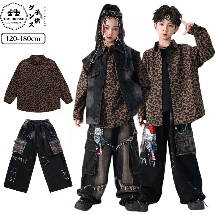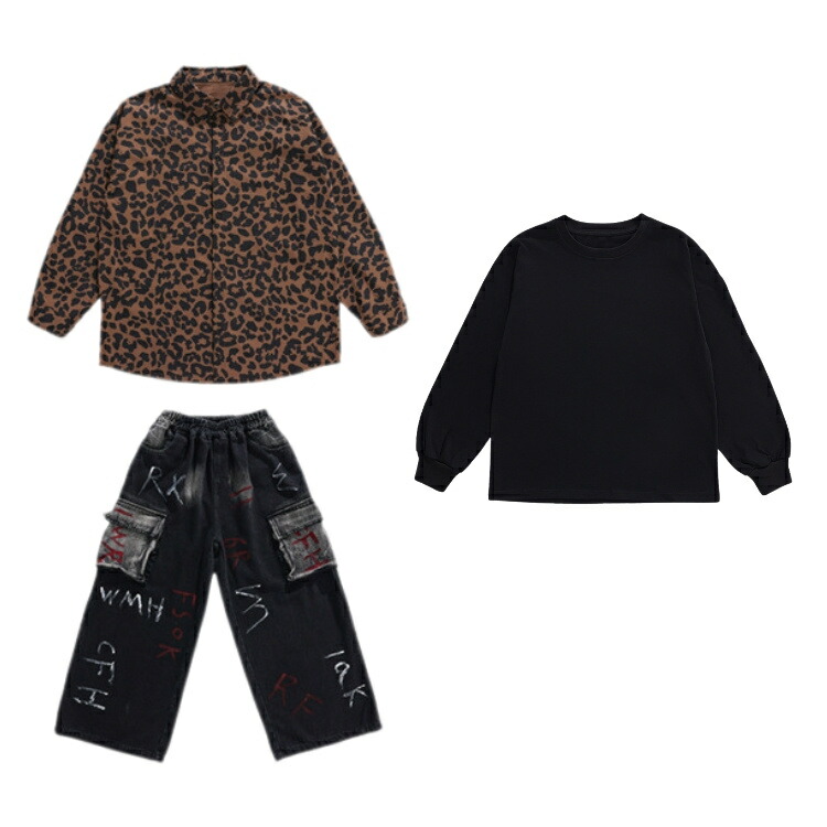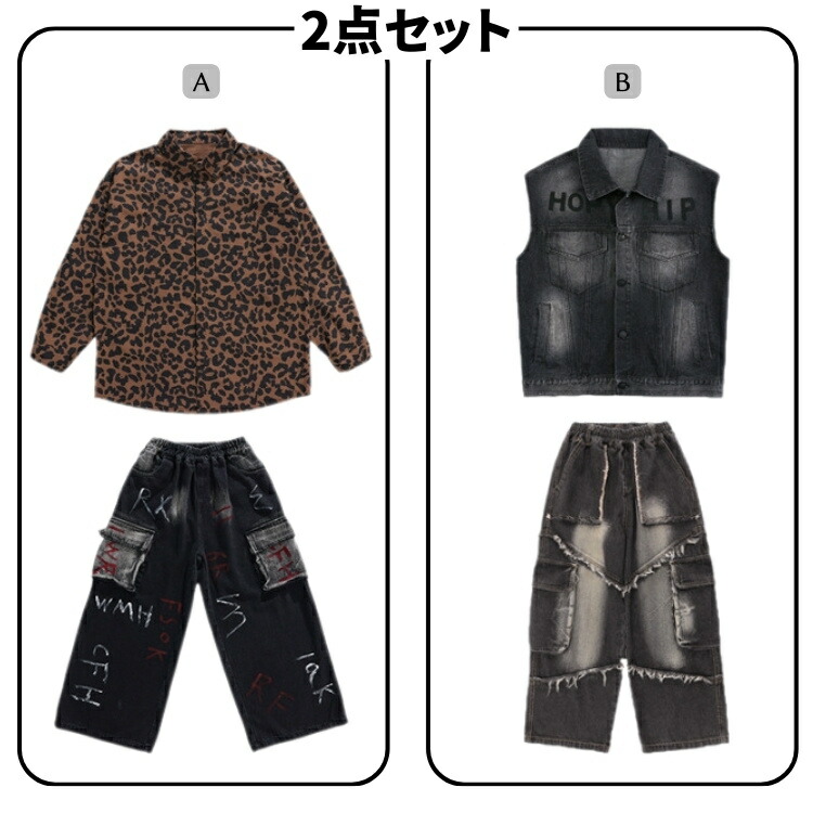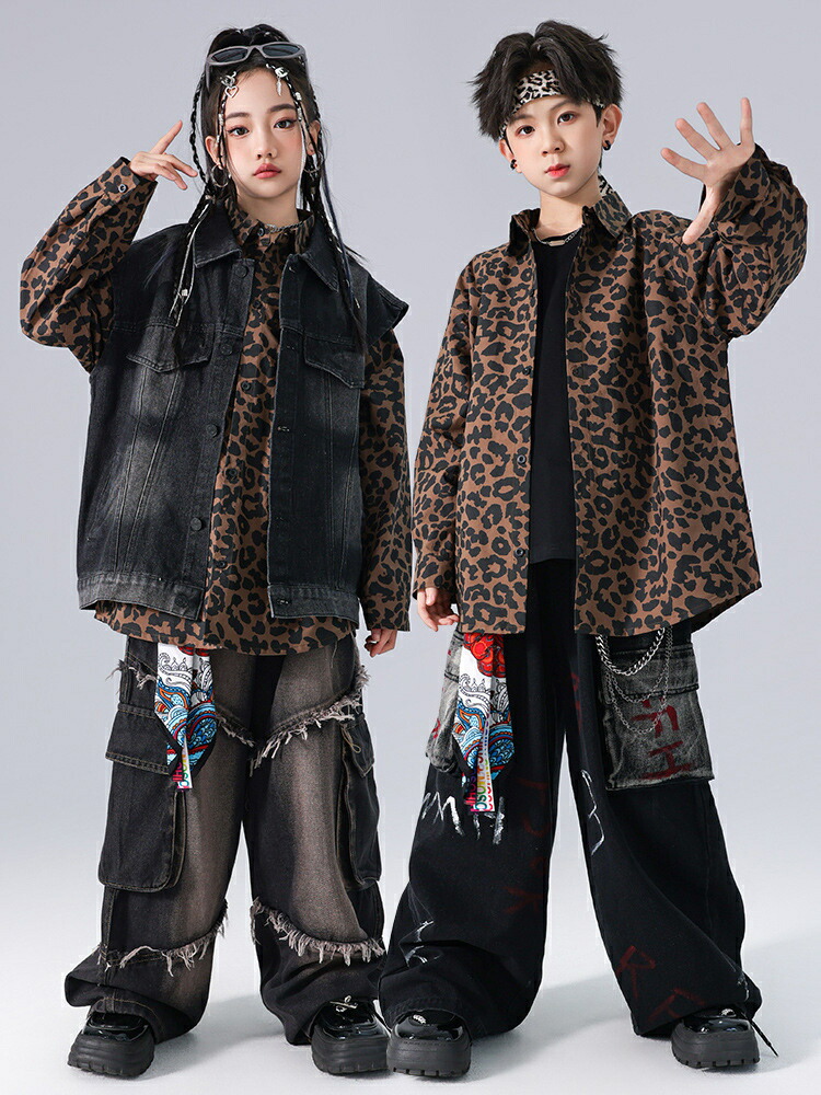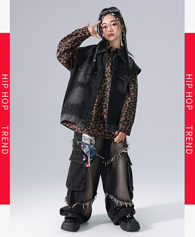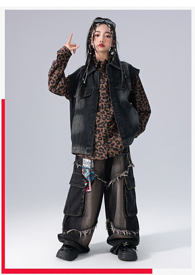 デニム ヒョウ柄 キッズダンス衣装 韓 キッズ スーツ カジュアルセットアップ カジュアルパンツセット 続々登場 黒トップス ヒョウ柄トップス デニムベスト デニムパンツA デニムパンツB 2点セットA 2点セットB 3点セットA 3点セットB 120cm 130cm 140cm 150cm 160cm 170cm 180cm