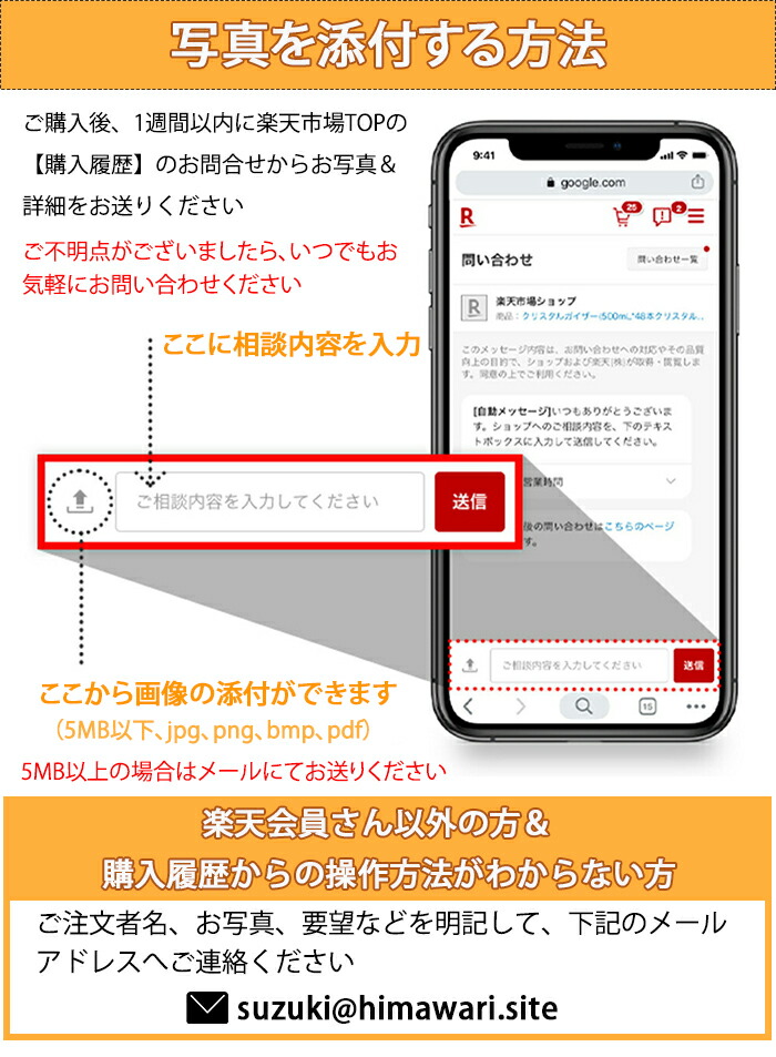 【購入履歴】→【詳細】→【ショップへの問い合わせ】→【その他】→ 【注文情報の追加連絡をしたい】→お写真&必要事項を送る