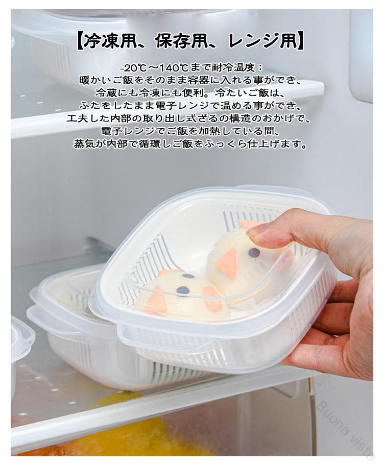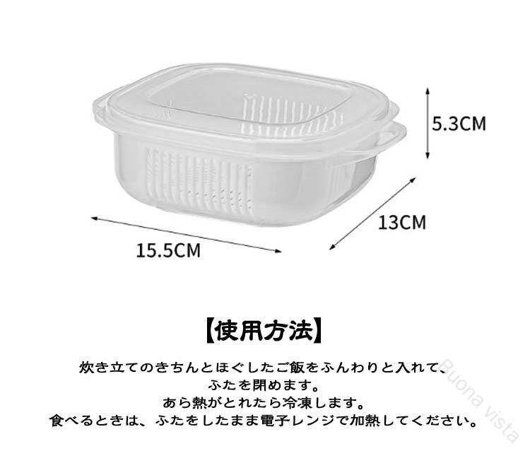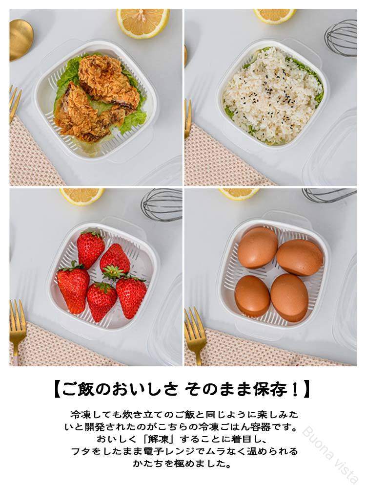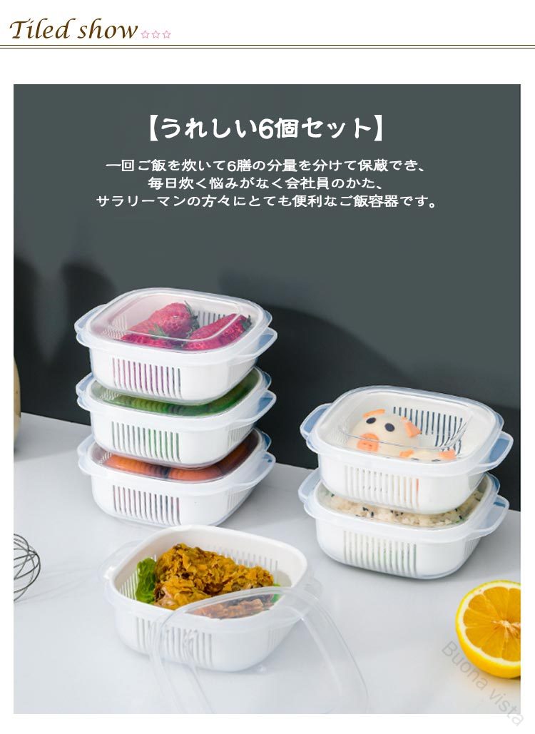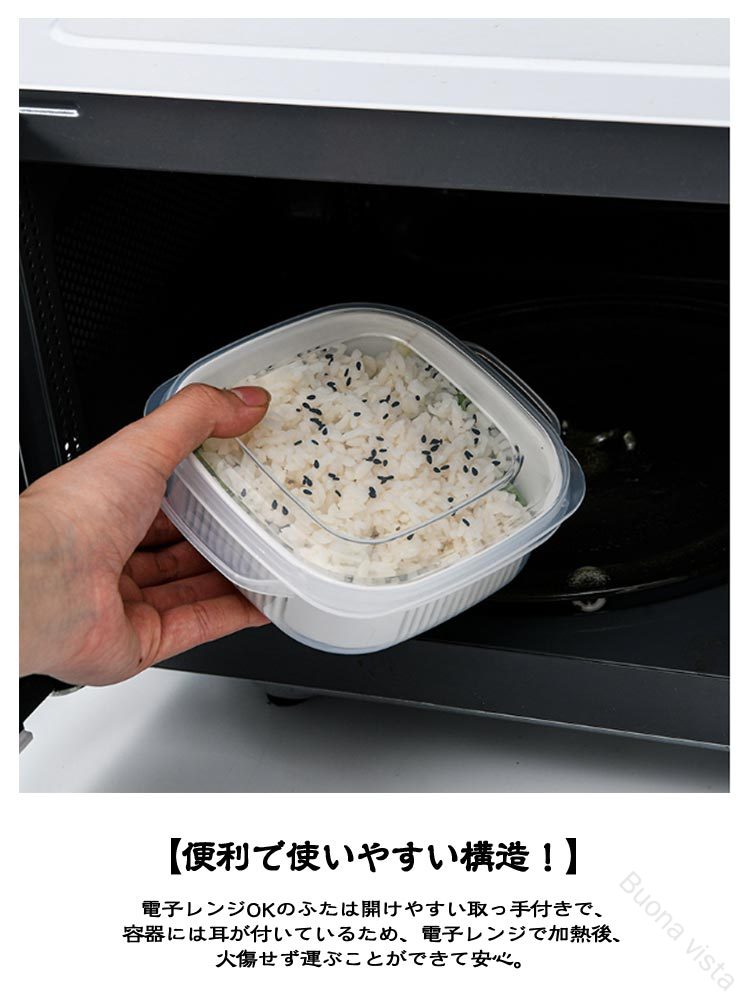 冷凍ご飯容器【6個セット】電子レンジ対応340ml/個【ご飯のおいしさ そのまま保存!】冷凍しても炊き立てのご飯と同じように楽しみたいと開発されたのがこちらの冷凍ごはん容器です。 おいしく「解凍」することに着目し、フタをしたまま電子レンジでムラなく温められるかたちを極めました。【うれしい6個セット】一回ご飯を炊いて6膳の分量を分けて保蔵でき、毎日炊く悩みがなく会社員のかた、サラリーマンの方々にとても便利なご飯容器です。【冷凍用、保存用、レンジ用】-20℃~140℃まで耐冷温度:暖かいご飯をそのまま容器に入れる事ができ、冷蔵にも冷凍にも便利。冷たいご飯は、ふたをしたまま電子レンジで温める事ができ、 工夫した内部の取り出し式ざるの構造のおかげで、 電子レンジでご飯を加熱している間、蒸気が内部で循環しご飯をふっくら仕上げます。【迅速に加熱する仕組み】さらに工夫した内部の構造が、取り出し式ざるのおかげで、ご飯を加熱している間、蒸気は内部で循環を促進しご飯をふっくら仕上げます。【便利で使いやすい構造!】電子レンジOKのふたは開けやすい取っ手付きで、容器には耳が付いているため、電子レンジで加熱後、火傷せず運ぶことができて安心。 分離式ざる付きで電子レンジで加熱する際、蒸気が内部で循環する構造。 分離式ざるは足が付いているため、お料理とつゆの分離もでき、保存だけでなくお料理にも使えて便利。【使用方法】炊き立てのきちんとほぐしたご飯をふんわりと入れて、ふたを閉めます。あら熱がとれたら冷凍します。食べるときは、ふたをしたまま電子レンジで加熱してください。