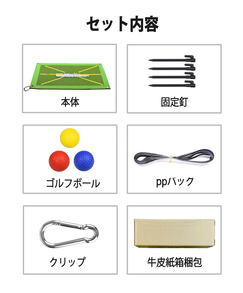 セット内容:本体、固定釘、ゴルフボール、面ファスナーテープ、登山フック、牛皮紙箱梱包