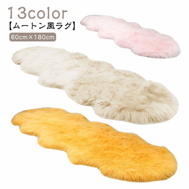 【60cm×180cm】【ムートン風ラグ】【13color】 いつものリビングルームがラグジュアリーな空間に早変わり!ちょっとだけリッチな気分を味わいたい時にぴったりのムートン風ラグマット。 リビングのフローリングに敷いたり、ソファにサッと掛けてもオシャレ。来客用のお部屋のアクセントにはもちろん、寝室でリラックスタイムを過ごす時にも。 まるでリアルファーのような毛足とふかふかの触り心地!ペットの背中を撫でているような、安らいだ気持ちでリラックスできる。 シックな色調の毛色で、モノトーンのインテリアやガーリーなファーニチャーにも合わせやすい♪温かい素材感なので、秋冬時期のお部屋の模様替えにもオススメ。