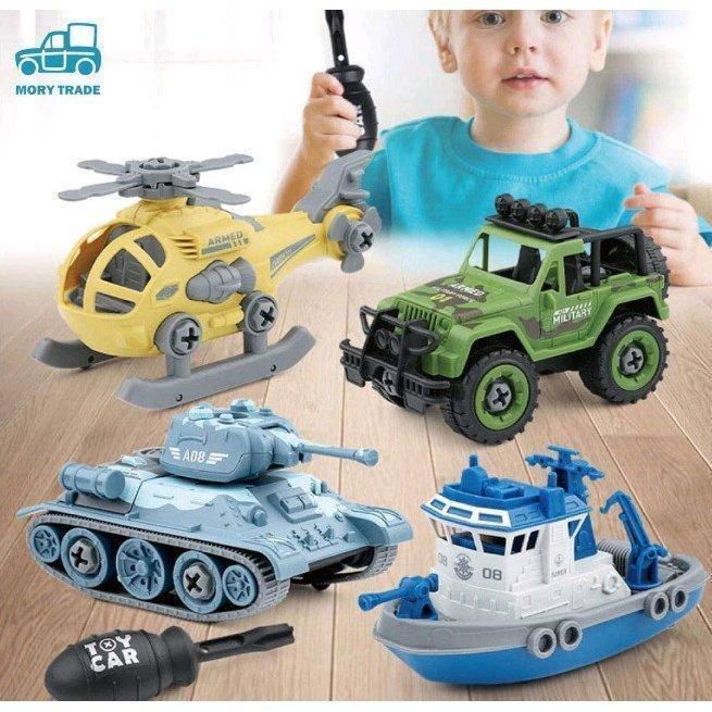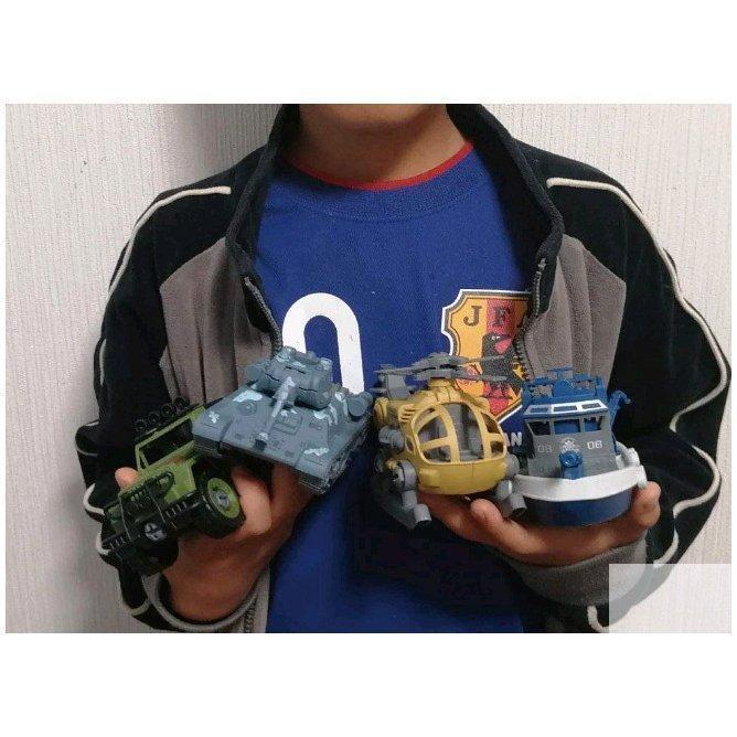 子どもたちのの組み立て式働く車、戦うクルマのセットです。付属の工具で子ども自身で組み立てを楽しみ、完成後は動かして遊べるので、知育玩具としても喜ばれています。