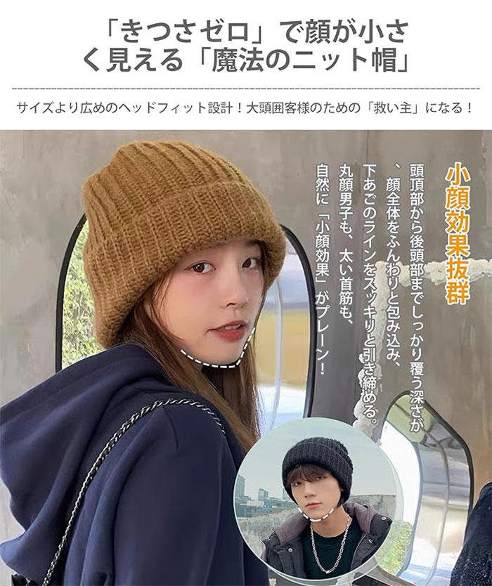 【大頭囲の救い主・小顔効果MAX!】大きめのサイズ設計で、頭囲が大きいお客様でも快適に装着できます。伸縮性に富んだ素材と、頭頂部が頭蓋骨の曲線にぴったりフィットする弧形の立体的なカットが特徴で、長時間着用しても締め付け感を感じません。帽子の高い深さが頭部をしっかり包み込み、自然な形で顔の形を補正し、顔をより小さく、より繊細に見せます。この厳しい冬、防寒帽子をぜひお試しください!