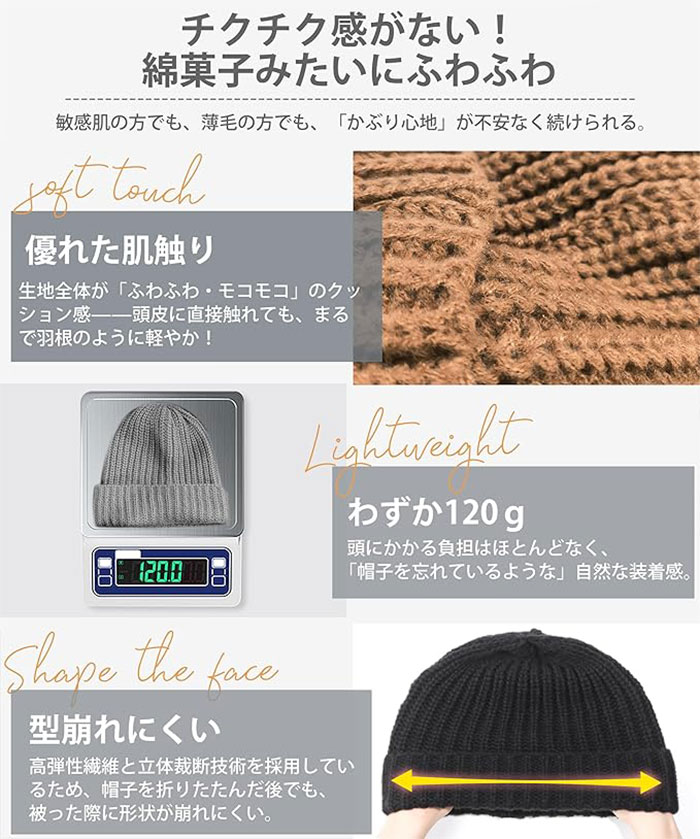 【触覚革命ニット帽・チクチク感を撃退】綿菓子のような柔らかな触感を実現した帽子 メンズです。糸自体に微細加工を施すことで、ボビンを完全に除去し、粗さを徹底的に排除しています。生地全体が「ふんわりとした柔らかさ」を呈し、頭皮に直接触れてもチクチク感がなく、「空気のような軽やかさ」をお届けします。敏感肌の方や髪の薄い方も安心してご使用いただけます。