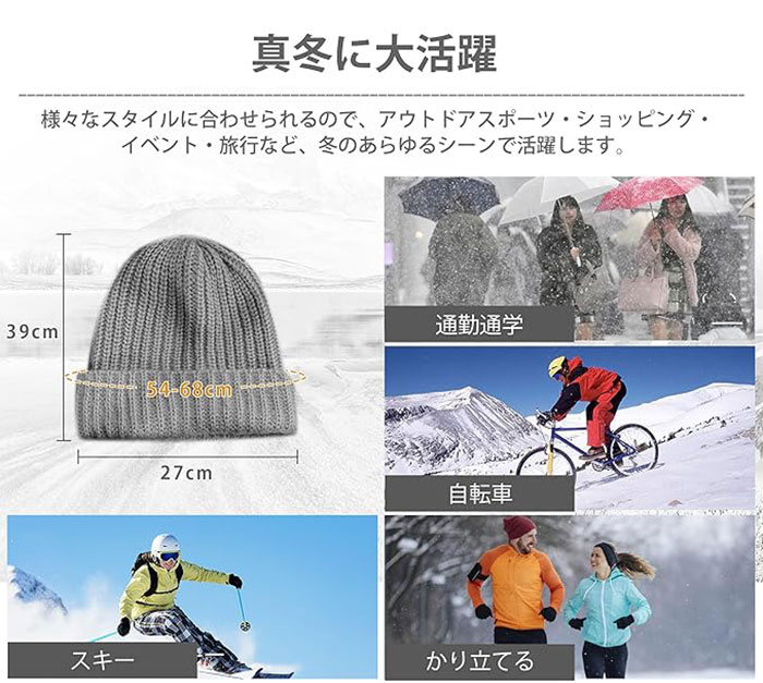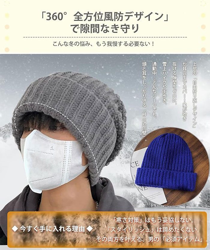 【スタイリッシュで暖かいニット帽】柔らかなニット生地を使用し、天然の空気層構造を持つ繊維で作られており、保温効果が30%向上します。マイナス10℃の厳しい寒さでも頭部を温かく保ちます。ニット帽の上部折り返しデザインにより、頭部と耳の周辺を厚く保護し、360°全方位から寒風から守ります。無地の帽子はシンプルながらスタイリッシュで、ファッショントレンドをリードします。