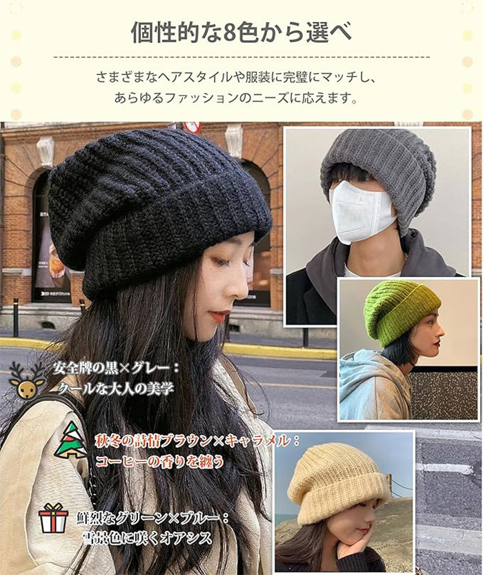 【真冬に欠かせないニット帽・男女兼用】8色展開で、万能の定番カラーである【安全牌】の黒とグレー、秋冬の雰囲気を存分に演出するブラウンとキャラメル、冬の単調さを打破するグリーンとブルーもおすすめです!モーターサイクルジャケット、デニムジャケット、ダウンジャケット、ワークスタイルのコートなど、どんなスタイルにも完璧にマッチします。男女兼用の理想のおしゃれニット帽です。本命帽子としてお選びください!