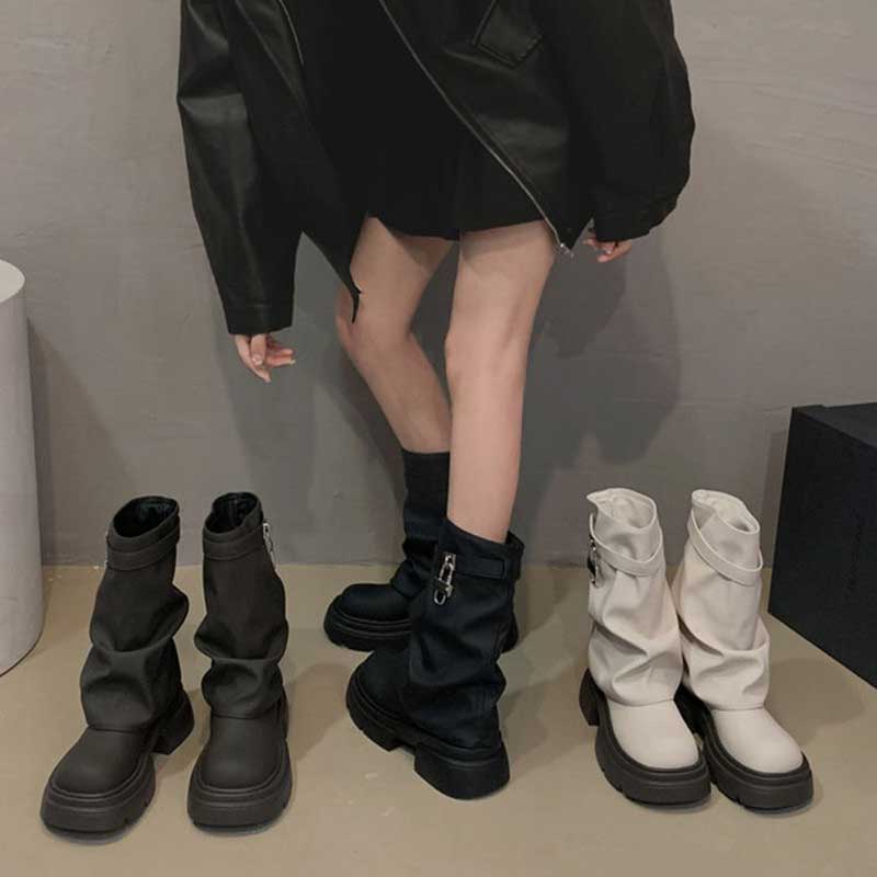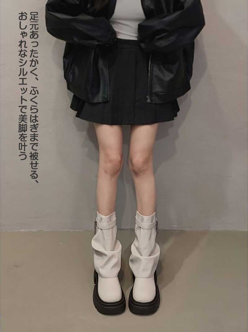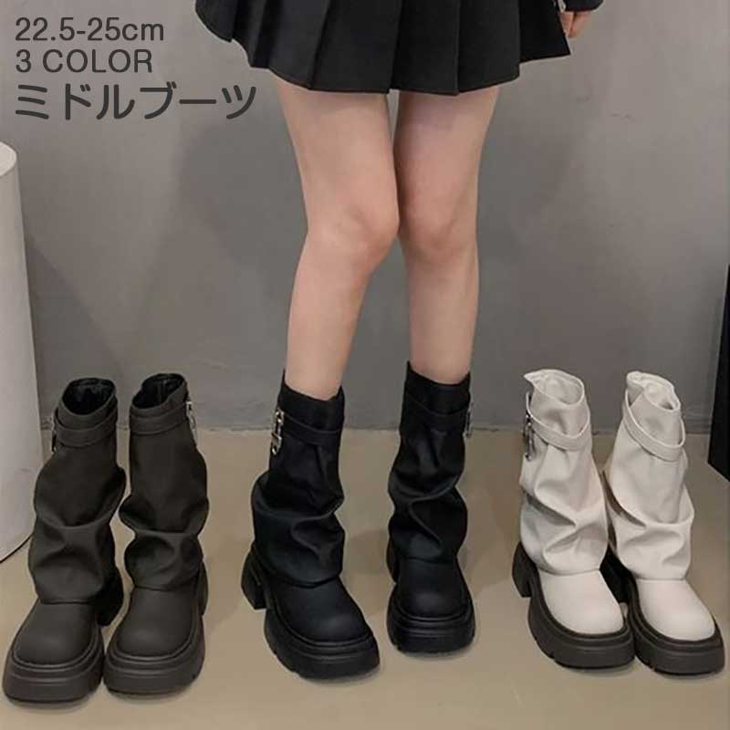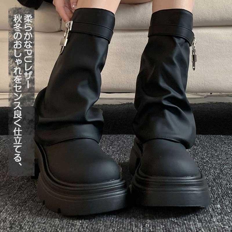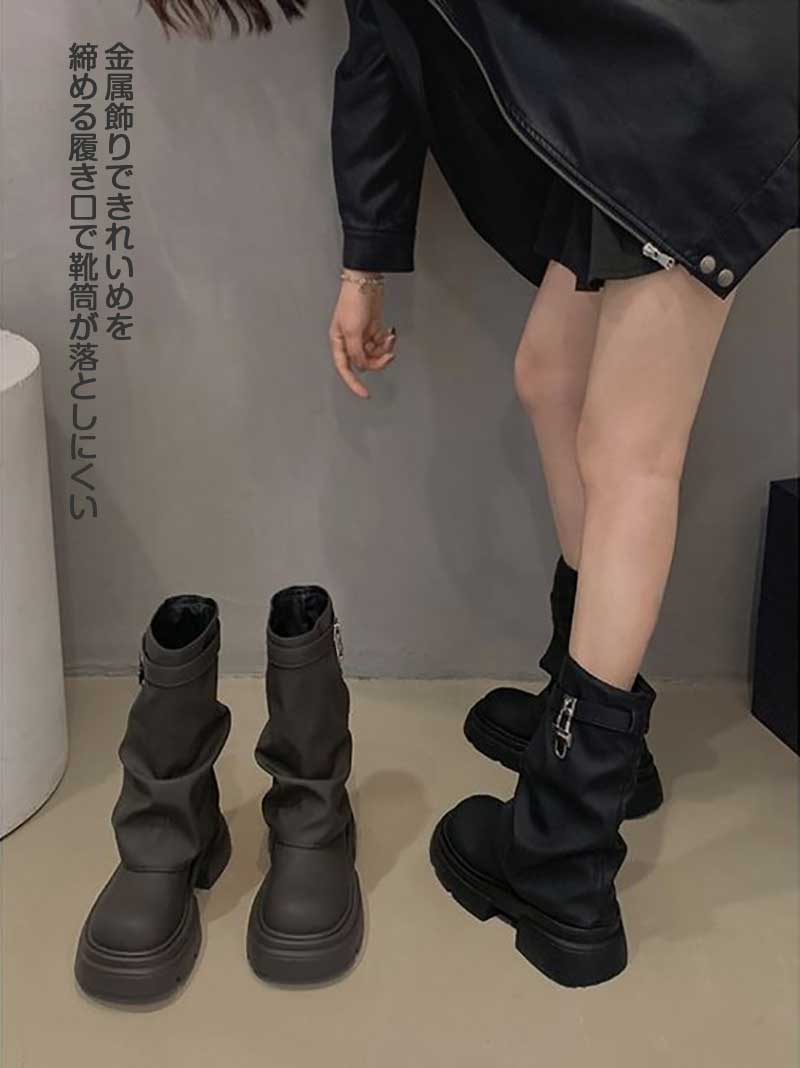 エンジニアブーツ ソックスブーツ ローヒール シューズ 太いヒール ミドルブーツ フェイクレザー スリッポン 靴 レディース 幅広