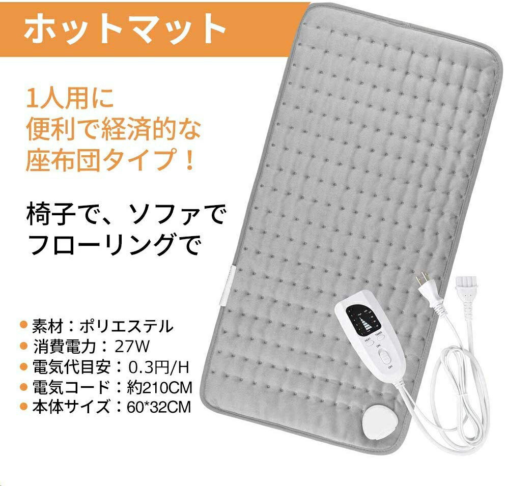 ホットマットは温度調整できるヒーター付きなので自分好みの暖かさに出来ます。使用場所に合わせて、温度を切り替えられる。40℃-60℃範囲に6つ段階に調節されます。30-120分間(30/60/90/120)範囲に4段階タイマー機能付きます。自動でスイッチをON/OFF。切り忘れ防止タイマーもつきで安心。省エネで、長い時間につけっぱなしでも大丈夫です。温度センサー付きのため、カーペットの温度を均一に上げることができます。電源コードは最大210cmで、テーブルの下、ソファ、またはベッドの上に置くことができます。サイズ:60*30cm。サイズは大きくなくて、軽くて折り畳みやすくて、良い収納は場所を取らなくて。