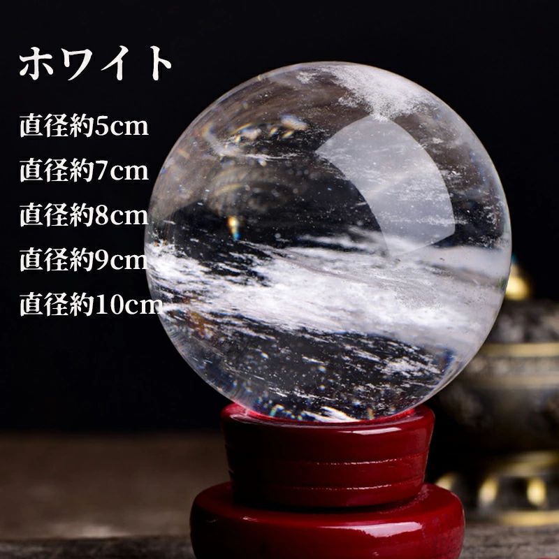 「天然」このホワイトクリスタルボールは100%純天然水晶から作成されます。一切の化学や染色などの処理は一切がありません。手作業で採掘、彫刻、精製されますので、内部パターンはそれぞれ異なっております。内部にはユニークなギャップがある可能性があります。でも、内部の亀裂や色は雲のようで、表面にも滑らかで感触がいいです。見た目は凄くゴージャス!
