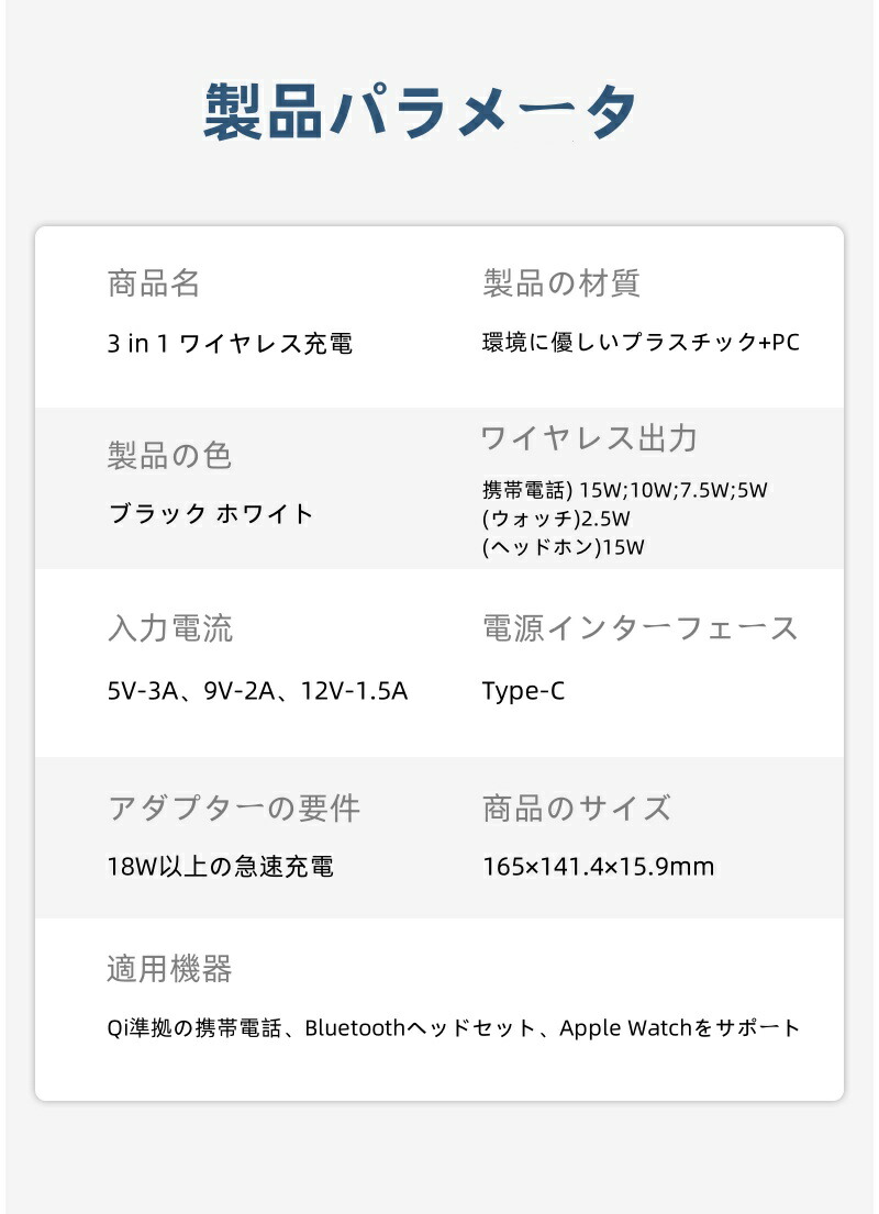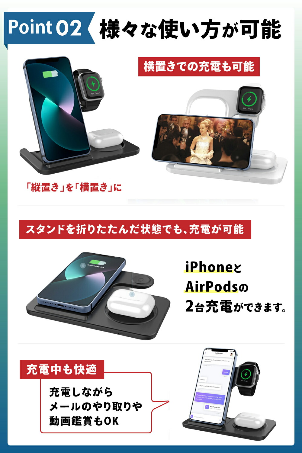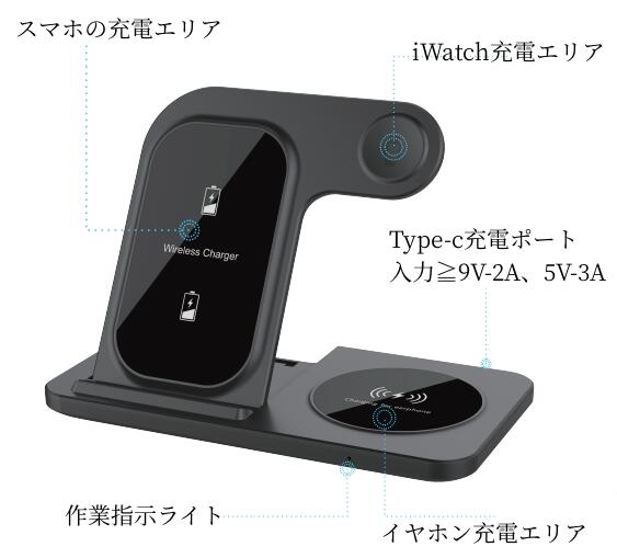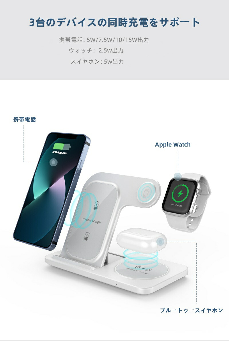 スマートフォン(ワイヤレス充電)+Apple Watch+Airpodsの3台を同時充電可能できます。