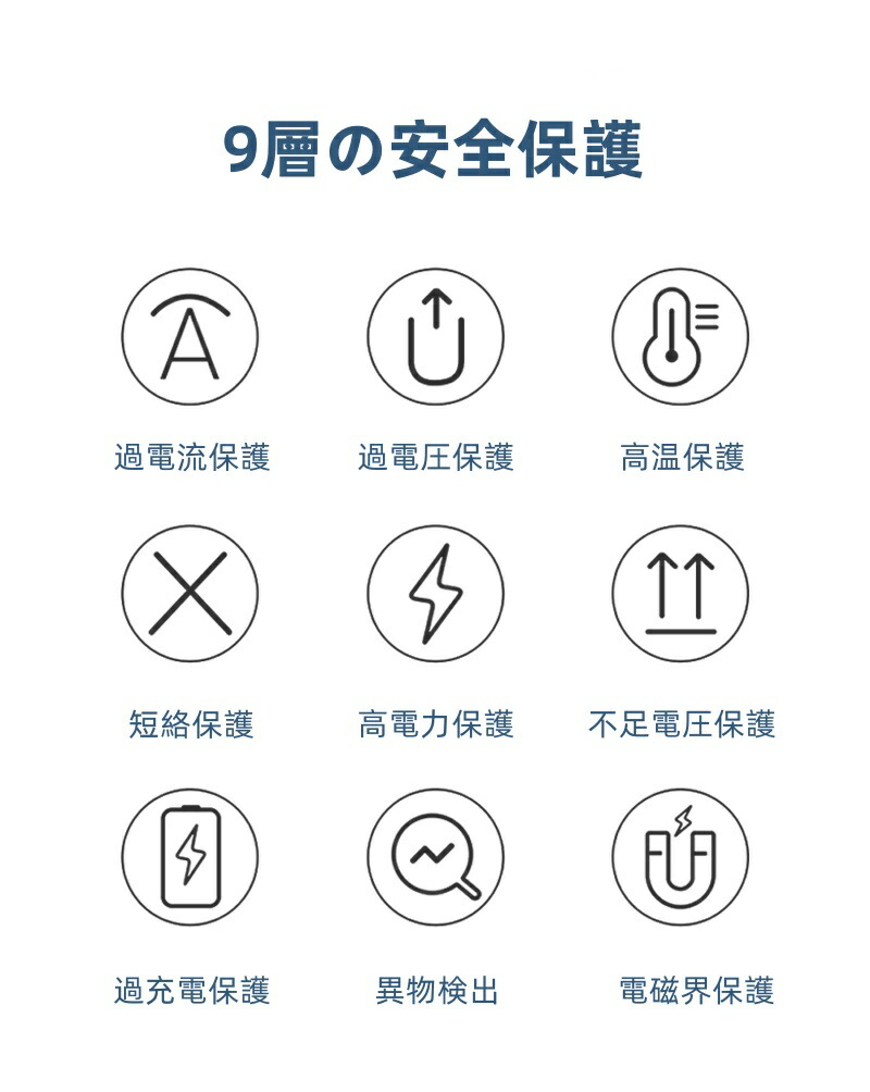 本商品にはスマートICチップを搭載し、過電流保護、過電圧保護、加熱保護、過充電保護、異物検知を有しております。安心して本商品をお使いいただけます。