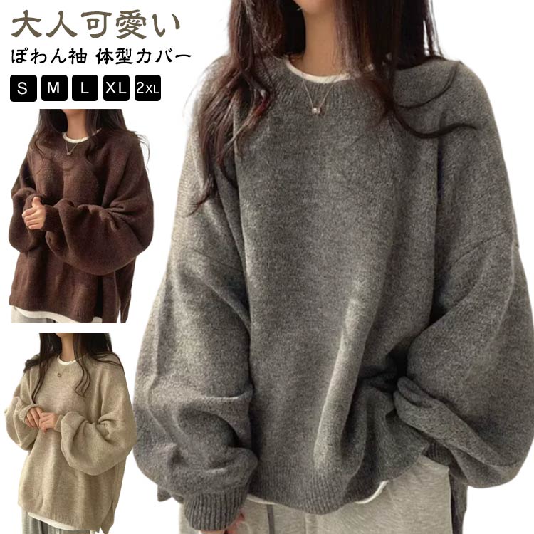 バルーン袖 ニット セーター クルーネ レディースファッション 早い者勝ち グレー ベージュ ブラウン カーキ S M L XL 2XL