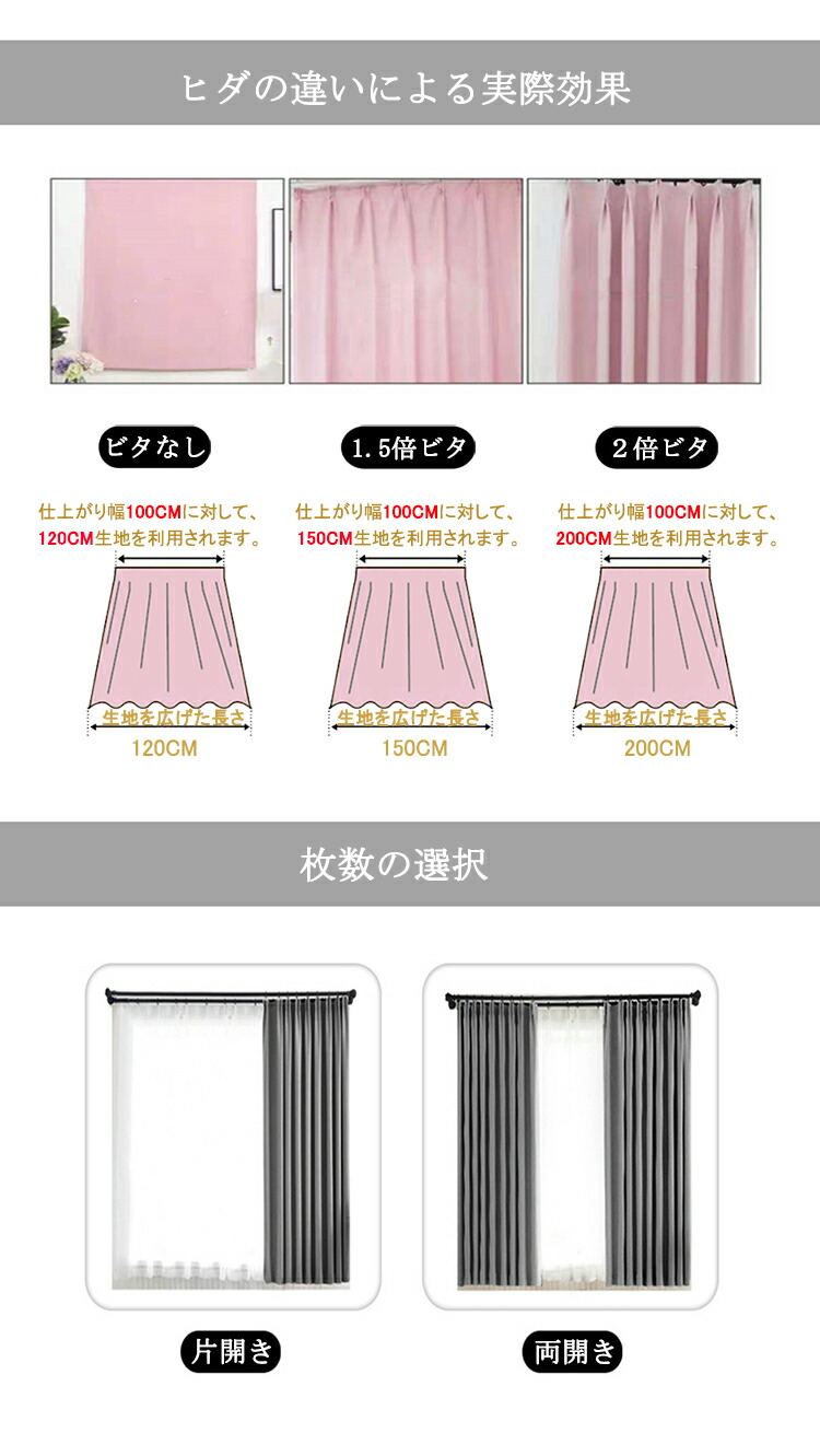 カーテン 1枚幅80-幅350cm遮光 ビタなし 1.5倍ビタ 2倍ビタ アジャスターフック 四爪フック リングフック