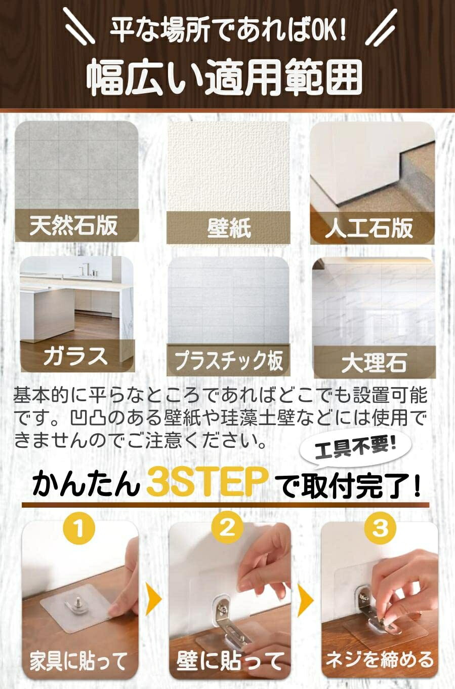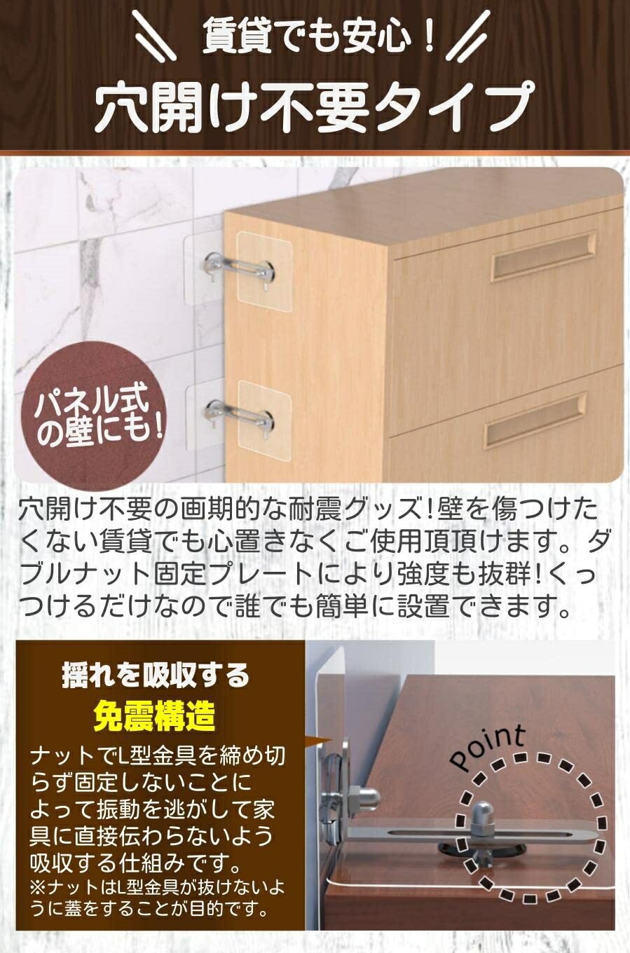 【穴開け不要・取り付け簡単】穴開け不要の画期的な耐震グッズ!壁を傷つけたくない賃貸でも心置きなくご使用頂頂けます。ダブルナット固定プレートにより強度も抜群!しっかりとしており、接着剤の残留がなく、貼り付けや取り外しが簡単で、壁面を傷めることもありません。くっつけるだけなので誰でも簡単に設置できます。