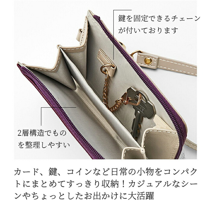 二層構造で細々の小物をすっきりと収納、鍵をしっかりと固定できるチェーンが付いています