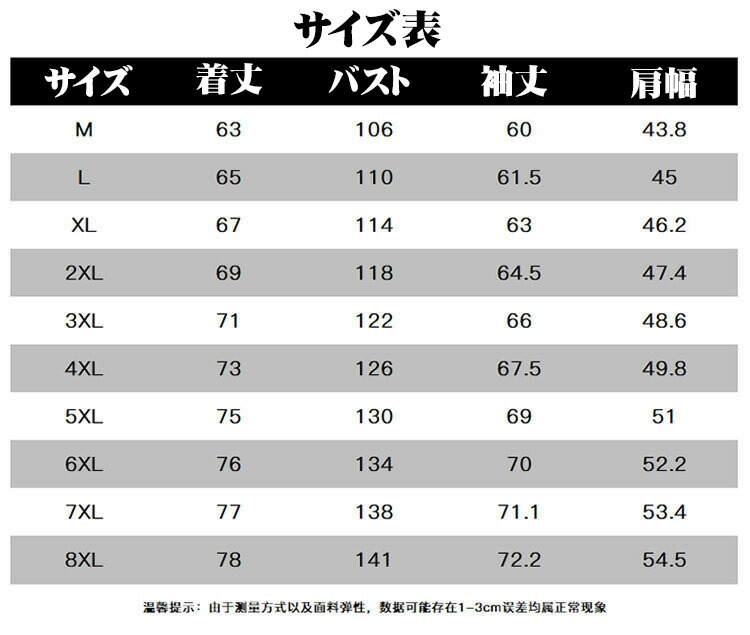 【サイズ】【Mサイズ】推奨身長155-165;推奨体重45kg-50kg;【Lサイズ】推奨身長165-170cm;推奨体重50kg-60kg;【XLサイズ】推奨身長170-175cm;推奨体重60-65kg;【2XLサイズ】推奨身長175-180cm;推奨体重65-70kg;【3XLサイズ】;推奨身長180-185cm;推奨体重70-75kg。【4XLサイズ】推奨身長183-188cm;推奨体重75-80kg。【5XLサイズ】;推奨身長185-190cm;推奨体重80-85kg。;※個人身長の差別によって、サイズ対照表は参考用だけです。
