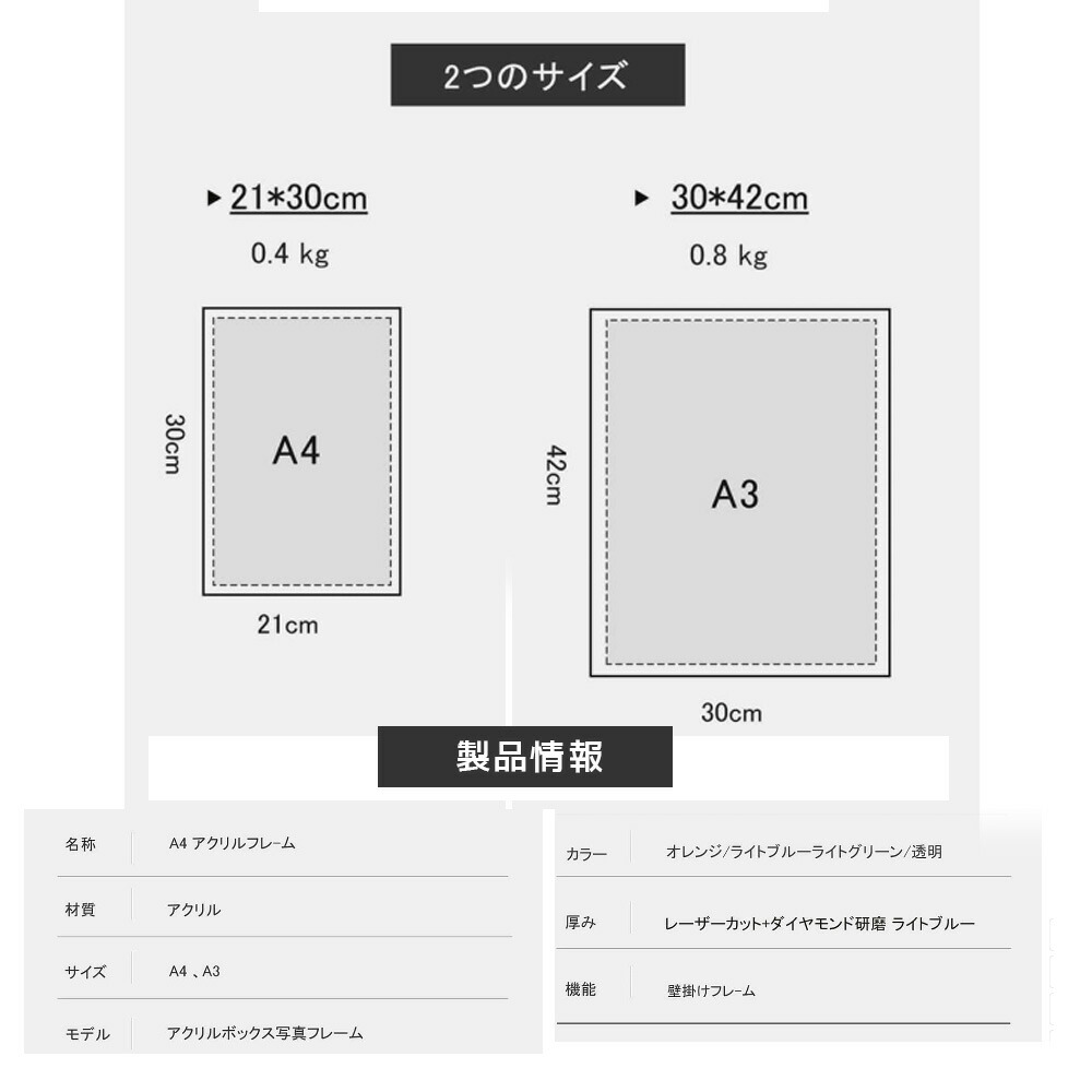 アクリルフレーム a3 写真フレーム オレンジ ライトグリーン ライトブルー 透明 A3 A4