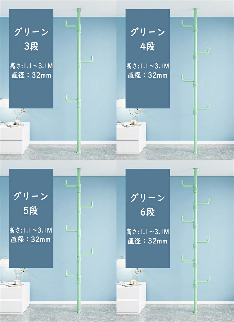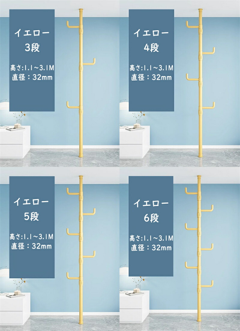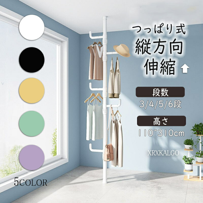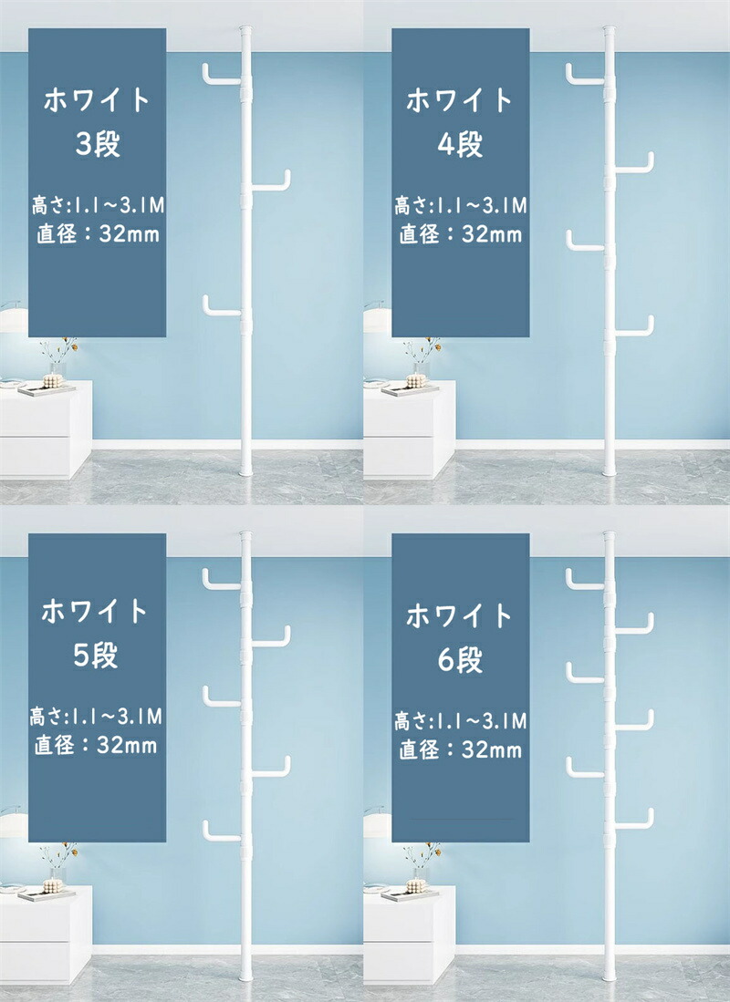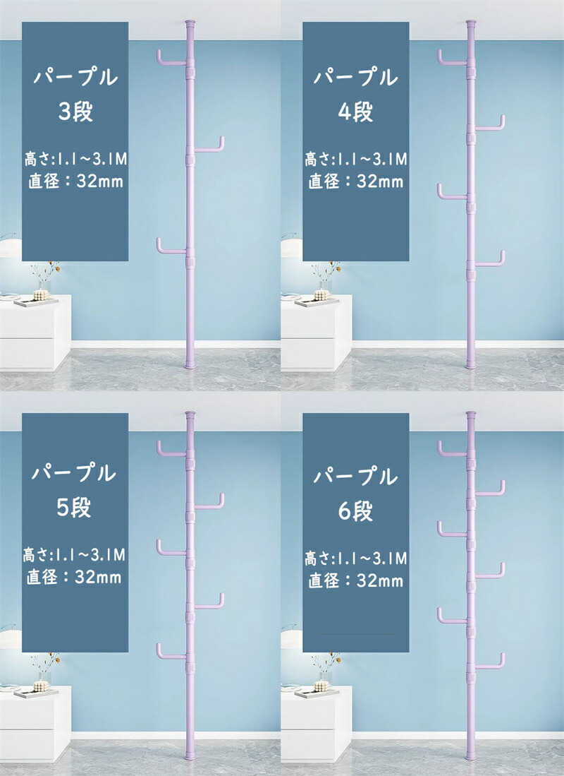 つっぱり式ポール 縦方向伸縮 110~ 3段 4段 5段 6段 ホワイト ブラック パープル グリーン イエロー