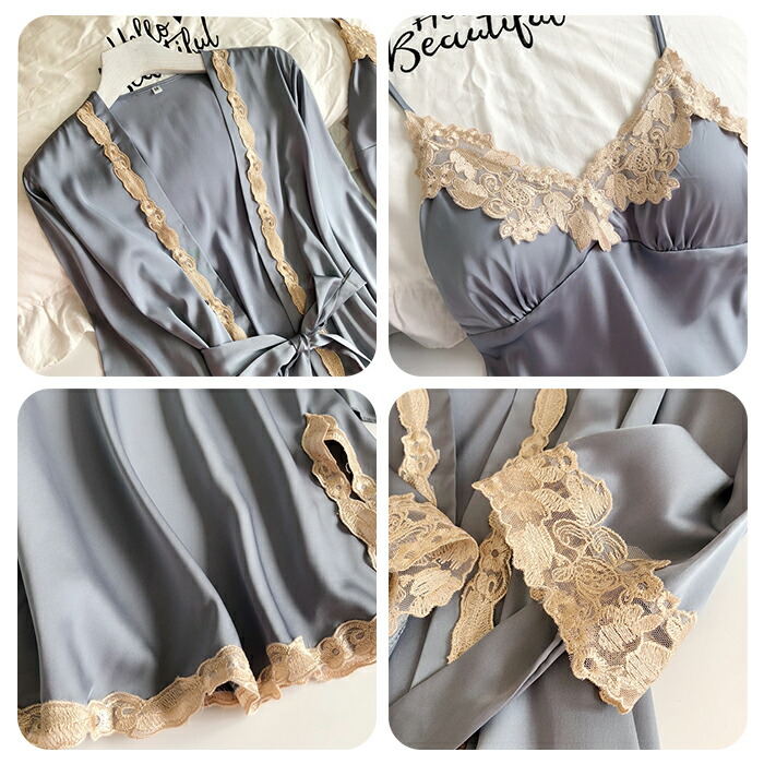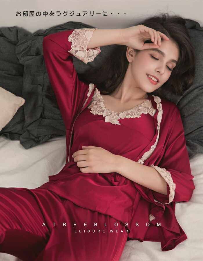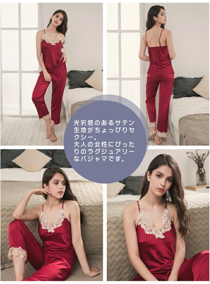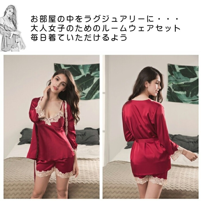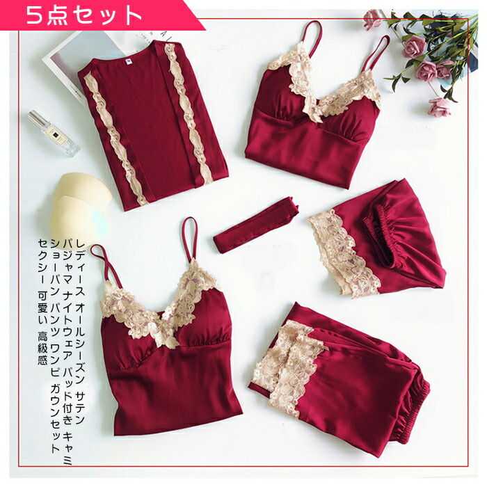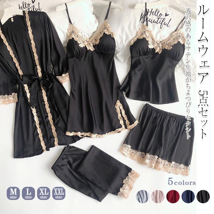 ルームウェア 5点セットサテンパジャマ インナー 下着 ナイトウエア 人気 M L XL XXL ワイン ライトブルー ネイビー ピンク ブラック
