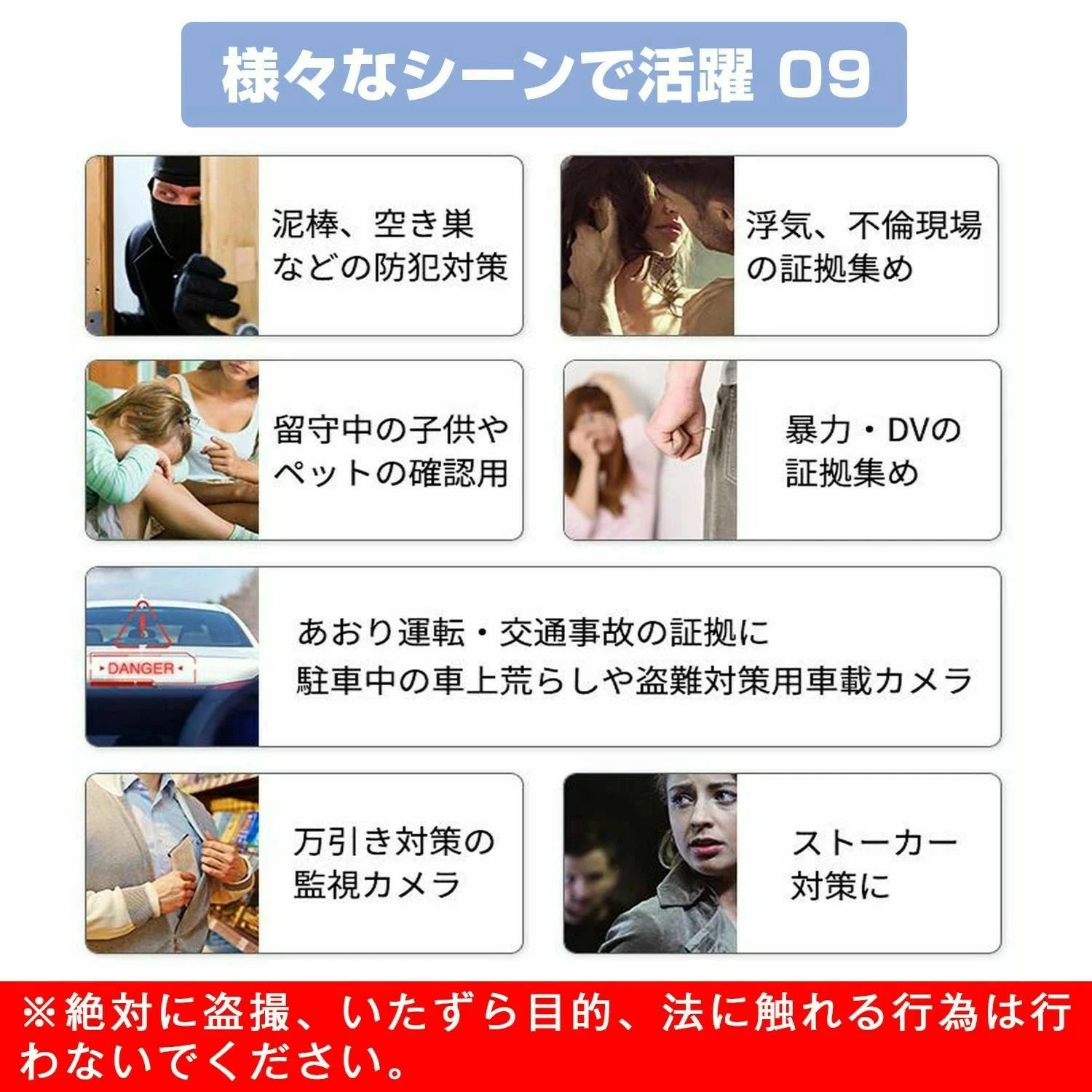 設置が簡単で場所を取らず、家、事務室、倉庫、店舗、庭などの場所で取り付けが可能です。自転車、屋外スポーツなどさまざまな場所に活用。子供やペットのお見守りや老人の介護の監視、調査のエビデンス、運動の撮影やビジネス記録に適応します。