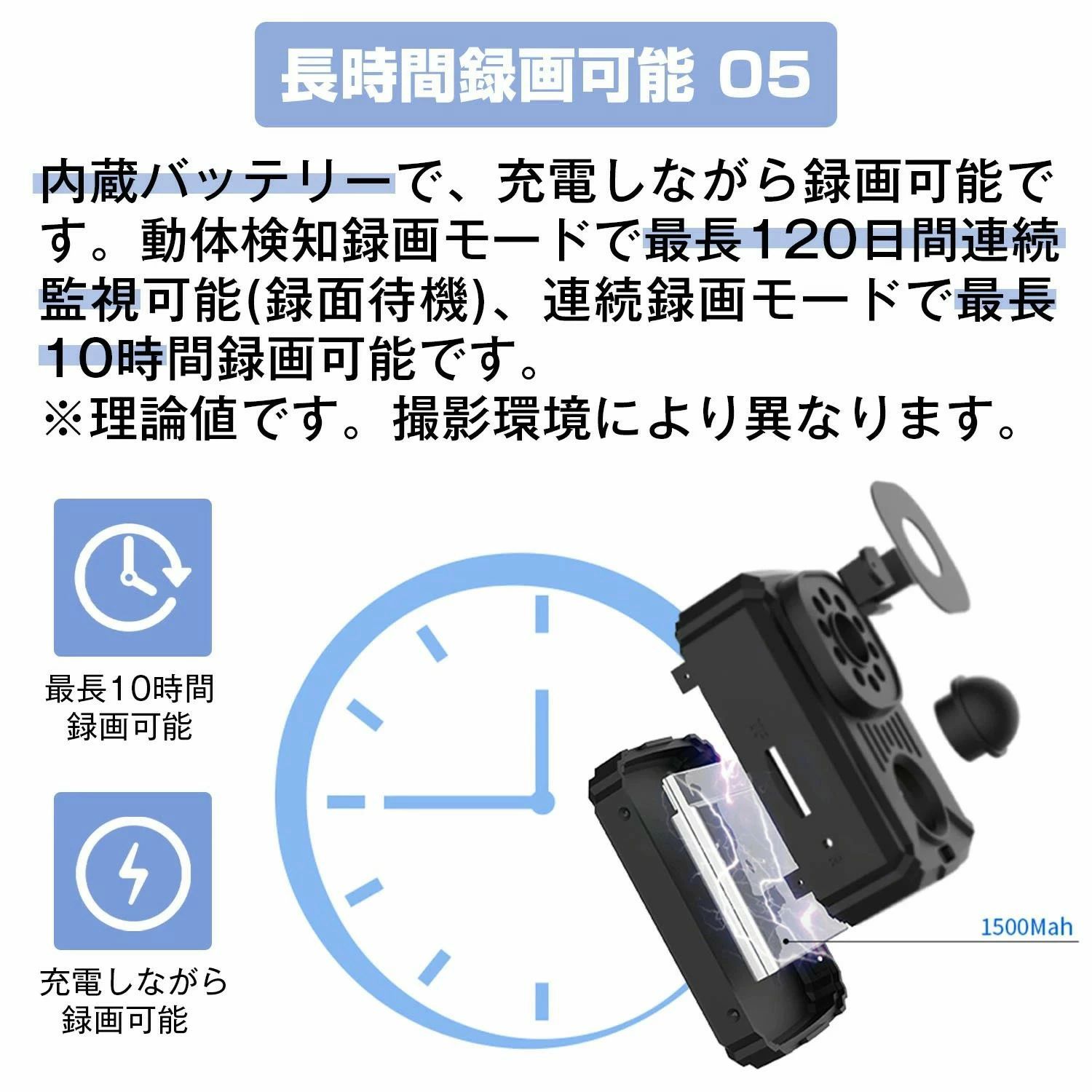 内蔵バッテリーで、充電しながら録画可能です。動体検知録画モ一ドで最長120日間連続監視可能(録面待機)、連続録画モ一ドで最長10時間録画可能です。