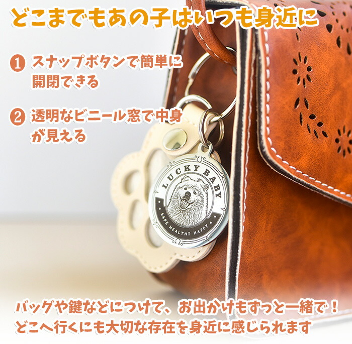 手のひらサイズで、バッグや鍵などにつけて外出先でも楽に持ち歩けます、どこにいても、いつでも大切なペットが身近に感じられます。