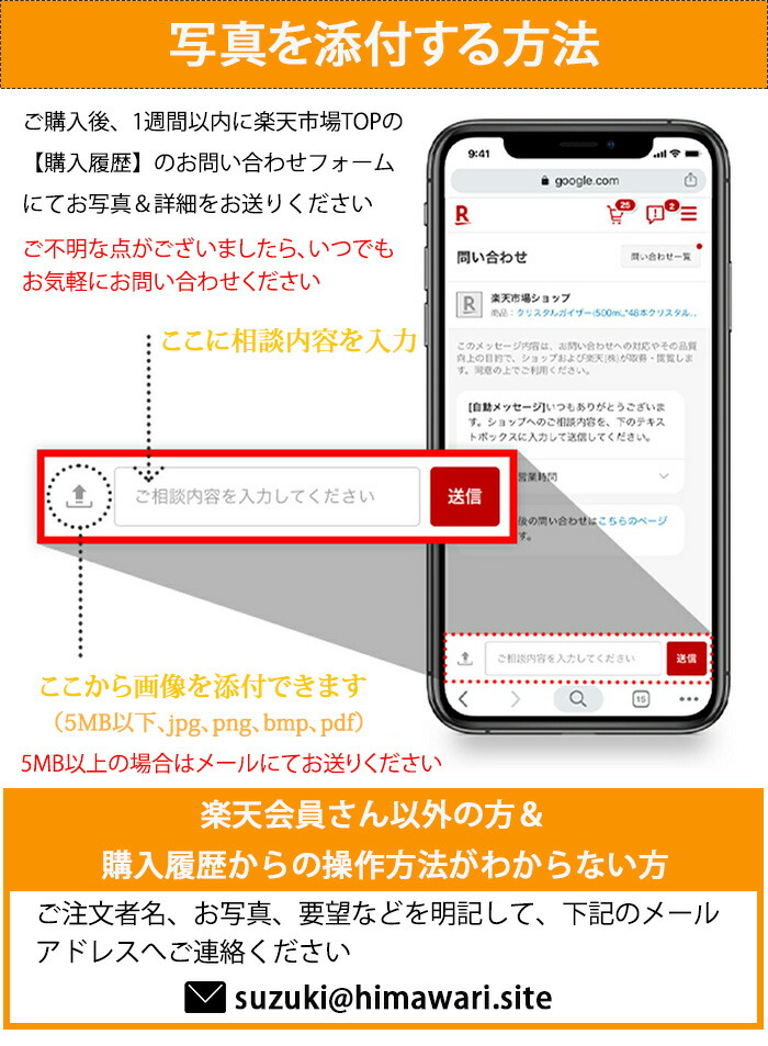 【購入履歴】→【詳細】→【ショップへの問い合わせ】→【その他】→ 【注文情報の追加連絡をしたい】→お写真&必要事項を送る