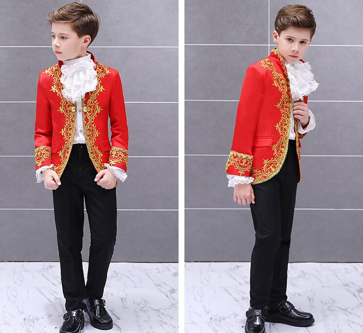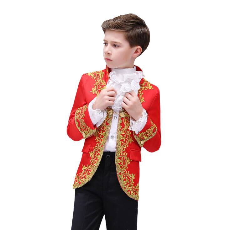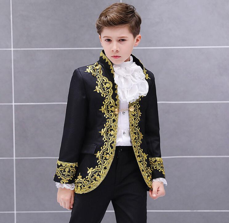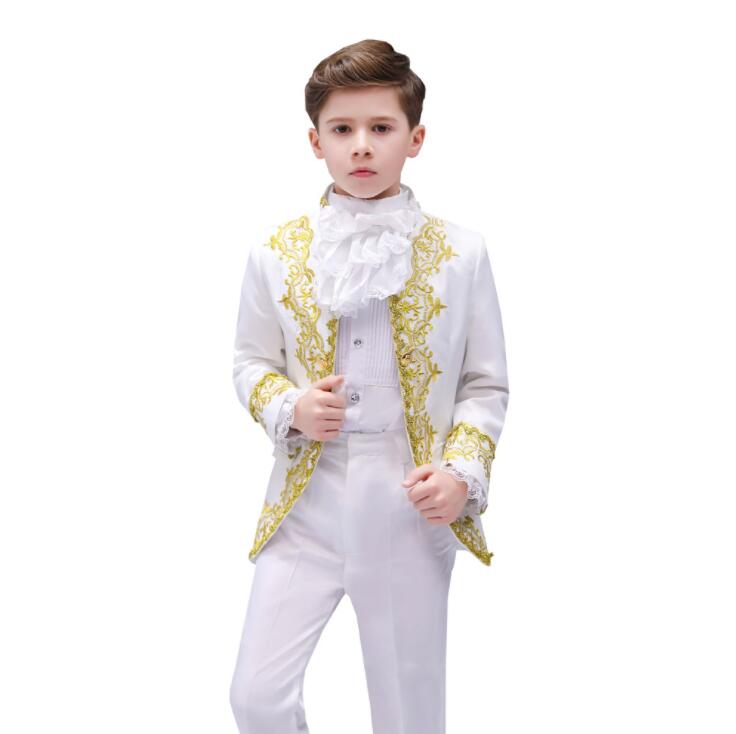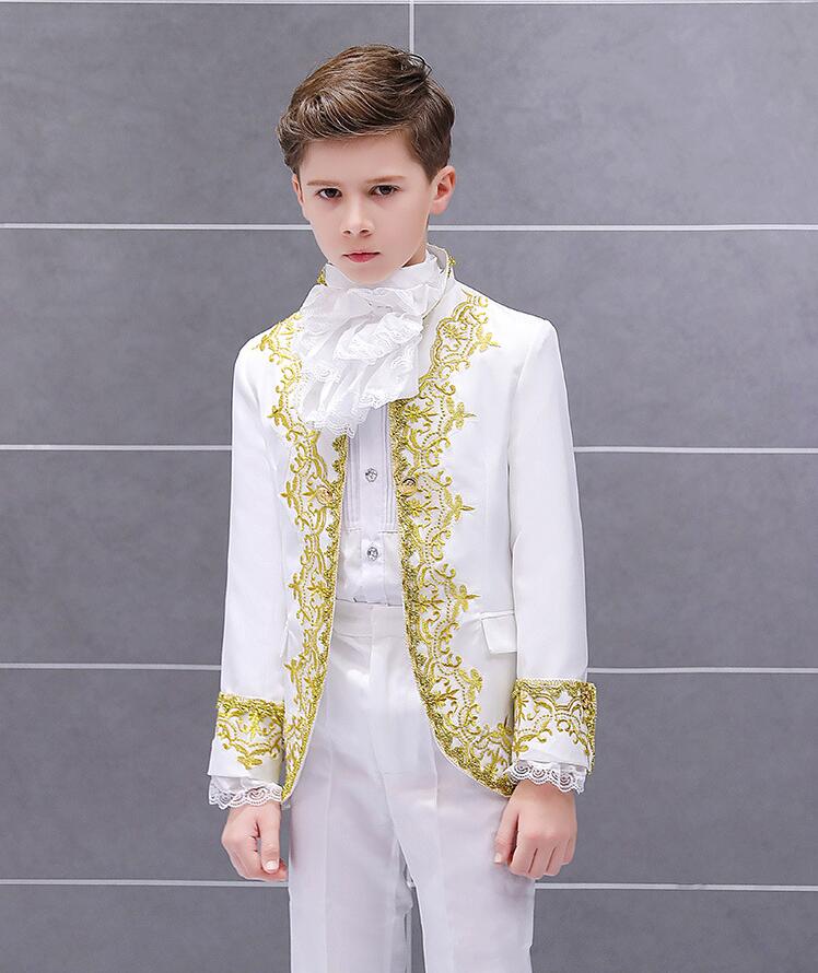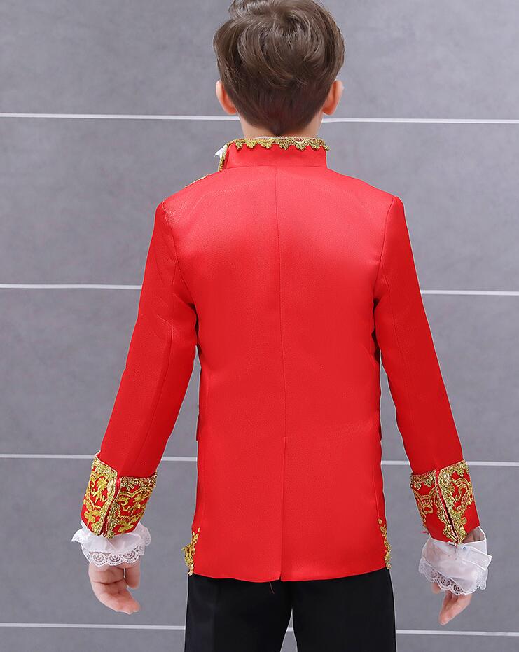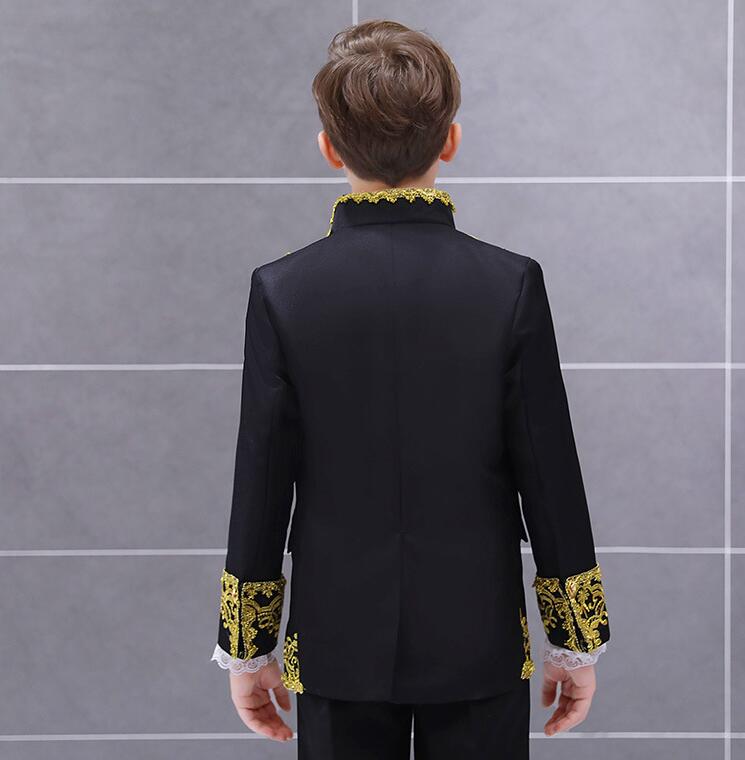 子供スーツセットアップ4点セット 男の子舞台ステージ衣装 貴族衣装 王子様コスチューム ミュージカル衣装 欧米王子様コスプレ舞台スーツ 舞台衣装 欧風 ヨーロッパ風 花柄刺繍 王族服 貴公子 公 王様
