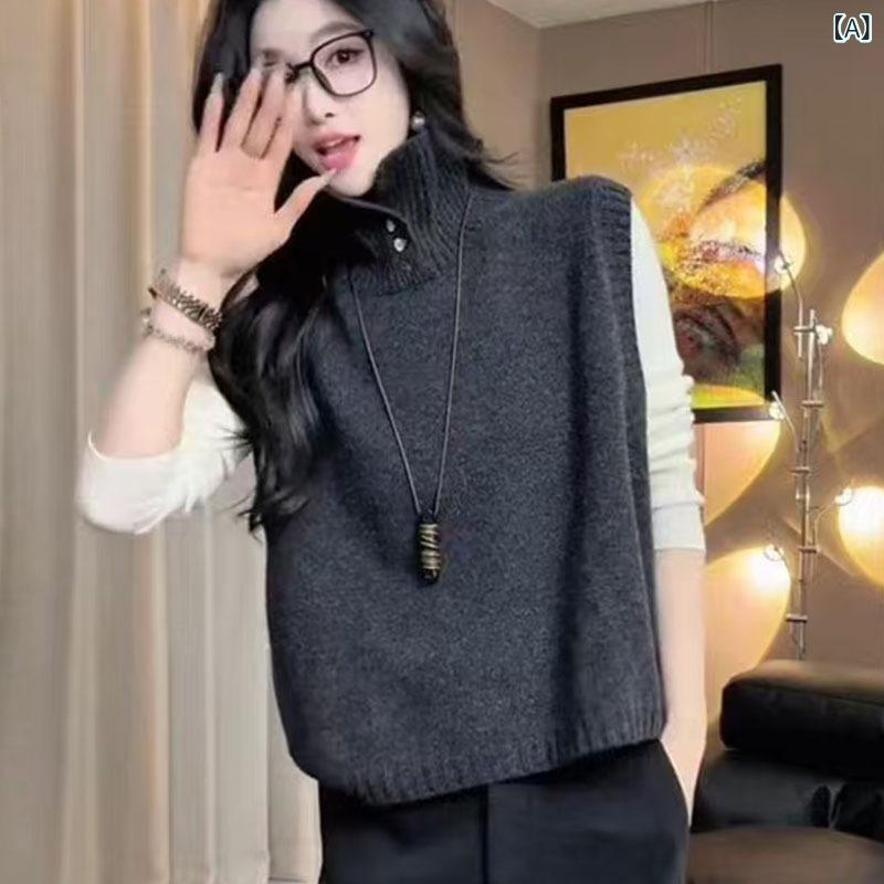 ニットベスト レディース 秋冬 高 襟 トップス ベスト 豊富 A:ダークグレー B:キャメル