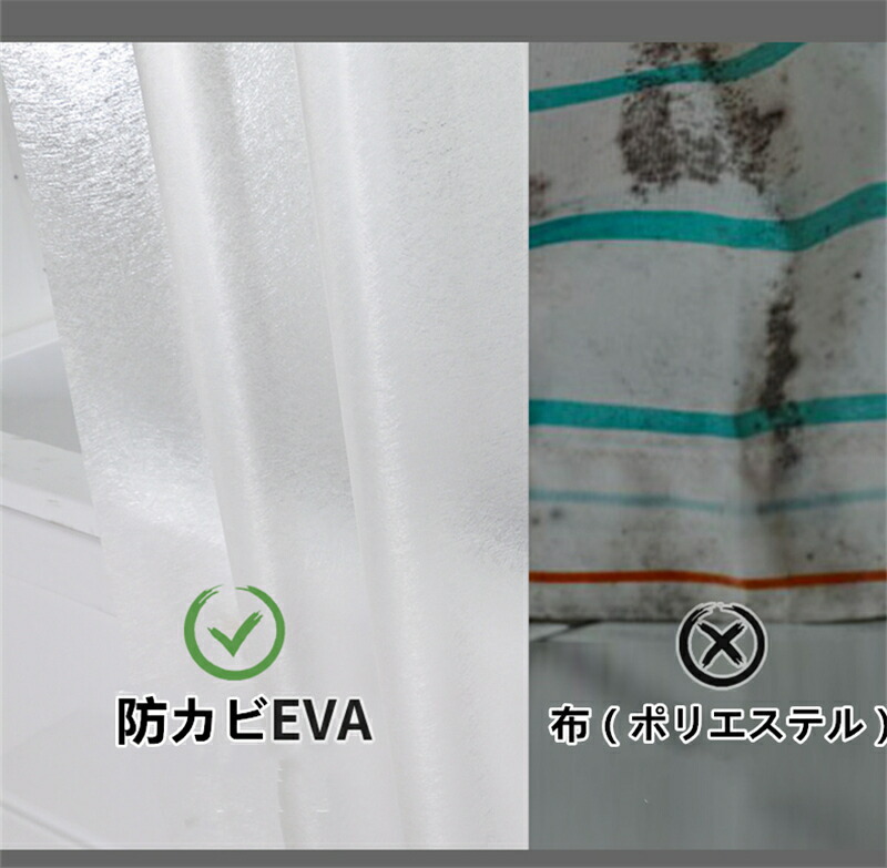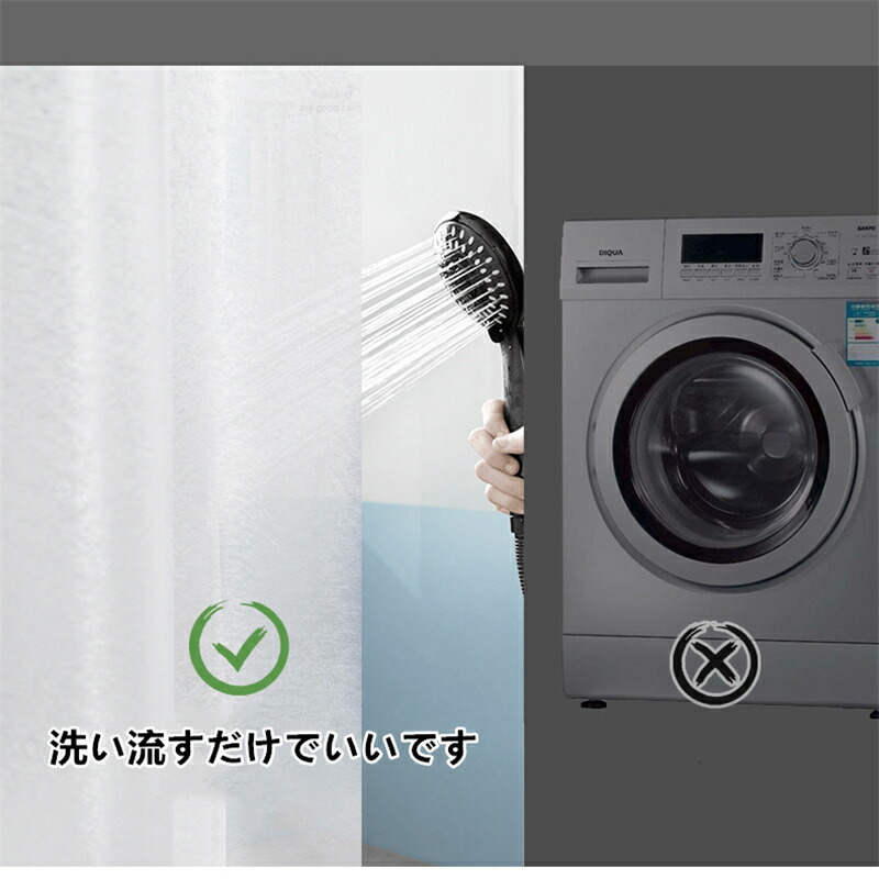 撥水;防カビ;防菌。シャワーカーテンは撥水防カビ加工で、カビも生えにくい、抗菌効果があり、衛生的です。