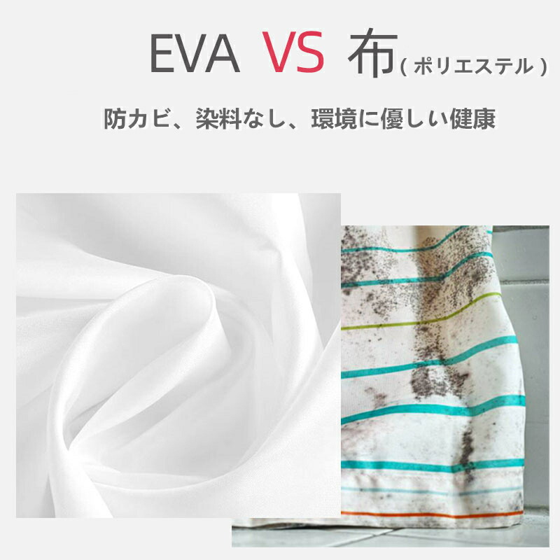 PEVA材質で、透明ではなく、破けにくい素材です。更に撥水防カビ加工で匂いもシワも無く、柔らかい触り感です。