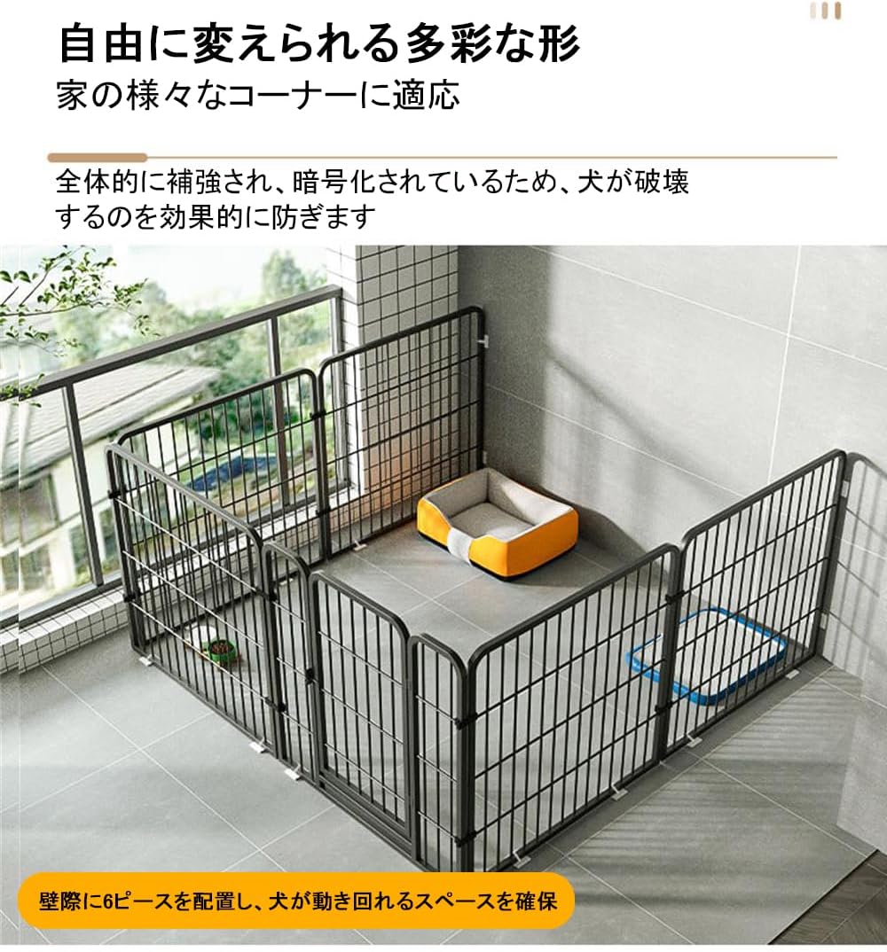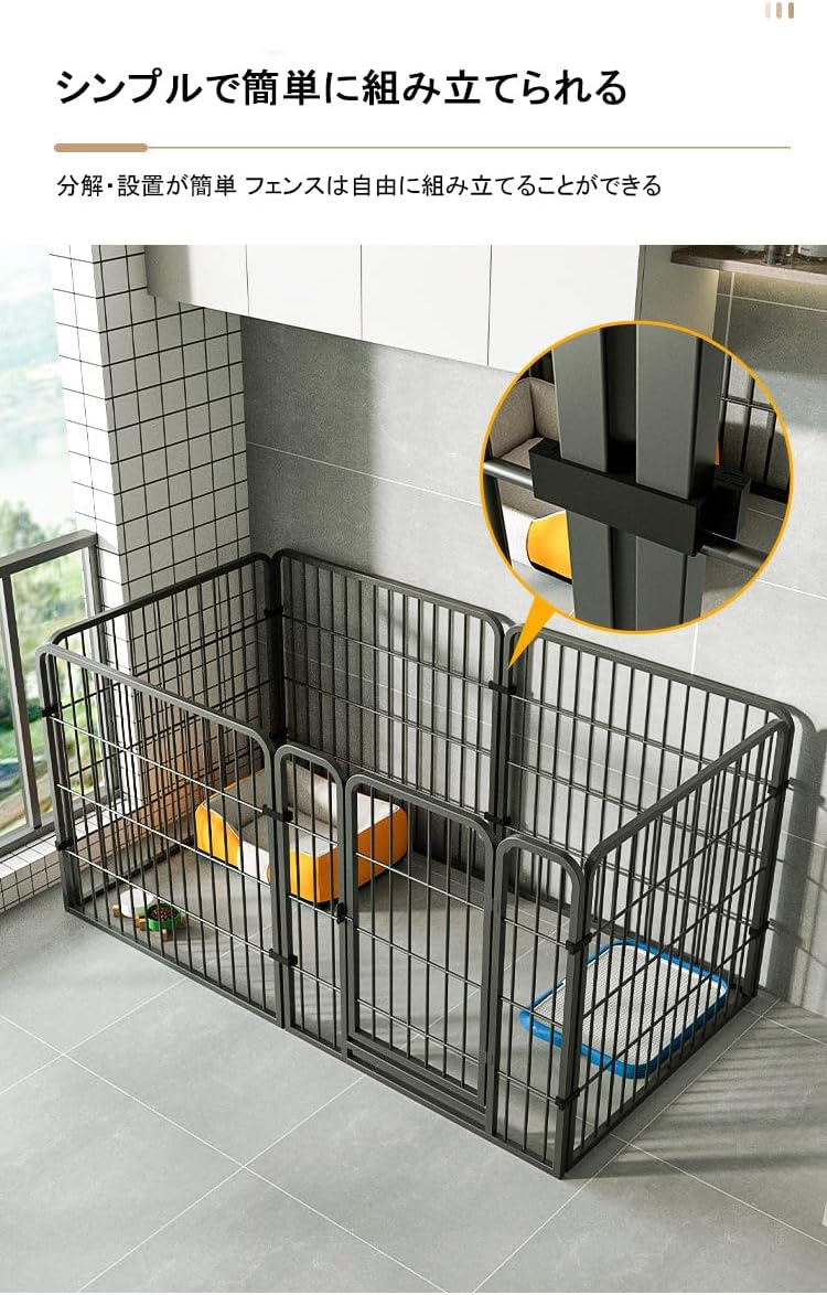 【形を自由にレイアウト立派な拡張性】 本ペットフェンスは、6枚個別の60幅のメタルパネルを組み合わせて構成されます。 幼犬、小型のペット、 ハムスター、うさぎ、モルモット、フェレットなどの小動物に最適です。 成長途中のワンちゃんを飼育している方や、将来的に数が増える予定なら、拡張性に優れているものが便利です。ペットフェンス自体の形を変えたり、別売りのパーツを追加して拡張できるものなら、ワンちゃんの活動スペースを広げることができ、お部屋の広さにも合わせやすいですよ。