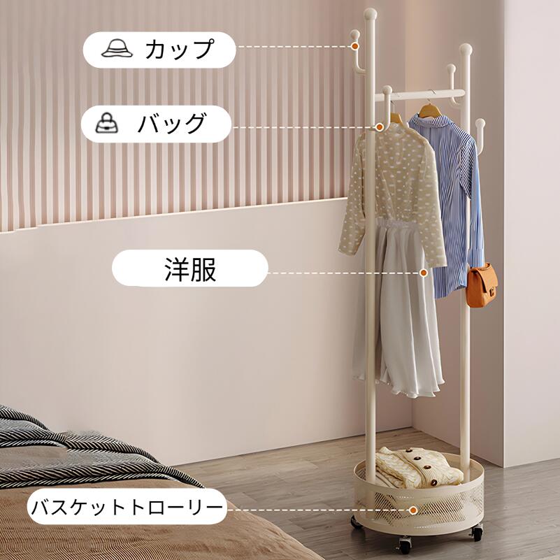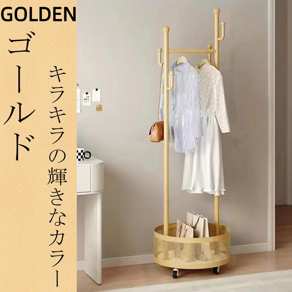 ハンガーラック スリム 棚付き キャスター付き 置物バスケット 多機能収納 組立簡単 バスケットトローリー コートハンガー 寝室 玄関 リビング 収納 ランドセル ゴールド ホワイトブ バッグ