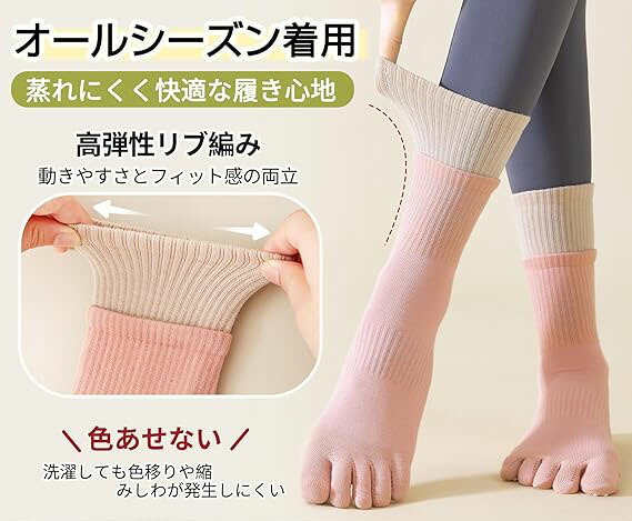 【5本足指が自由に動く】素足に近い感覚の5本指タイプで、どんなポーズにも対応できます。指を一本ずつ自由に動かせるため踏ん張りが効き、ヨガやフィットネスでのパフォーマンス向上につながります。足指の動きをサポートし、自然な感覚でトレーニングが可能。足を温めながらしっかりと地面をとらえバランスを保つことができます。足先を温めて冷えを防ぎます。窮屈感なく快適な履き心地を実現しました。