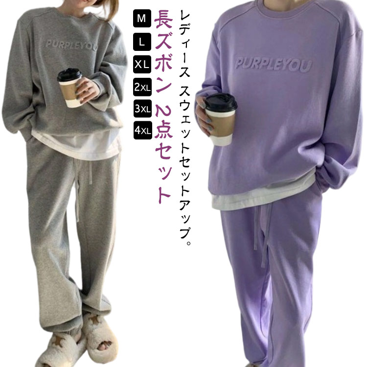パープル 紫 レディース 上下セット スウェット 長袖 長ズボン 2点セット ジャージ 上下セット スポーツ 部屋着 ゆったり ナイトウェア