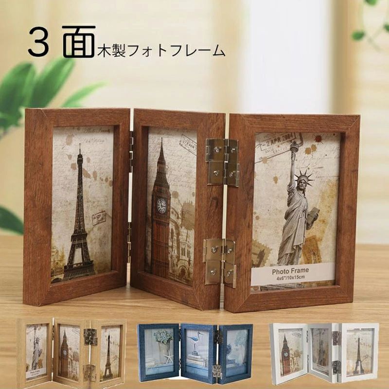 フォトフレーム 2l l判 3面 サイズ 木製 写真立て 両面 スタンド 3枚 6枚 複数 縦置き 白 青 茶 おしゃれ 三面 折りたたみ 卓上 かわいい