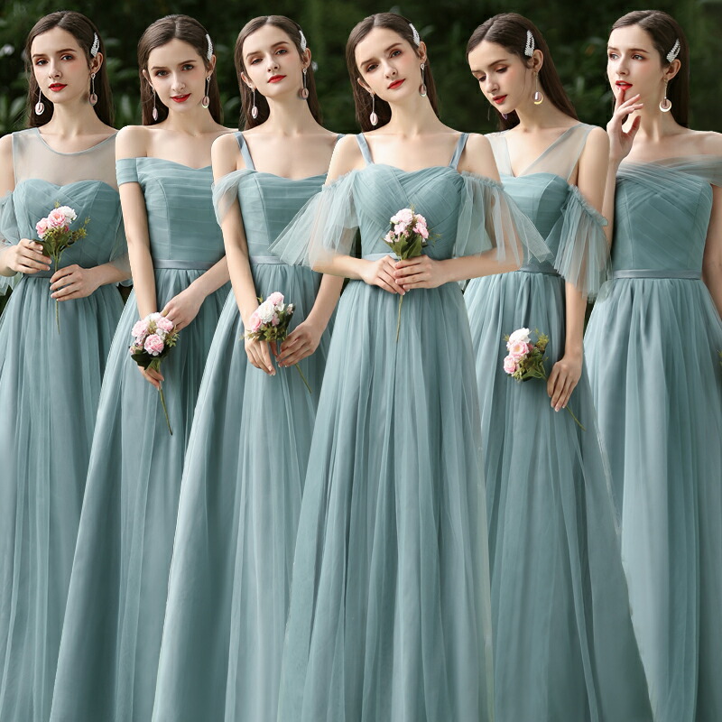 ブライズメイドドレス ロング丈ドレス ブルー グレー ピンク グリーン フォーマルドレス イブニングドレス パーティードレス ライン フレア ワンピース 記念日 発表会 結婚式