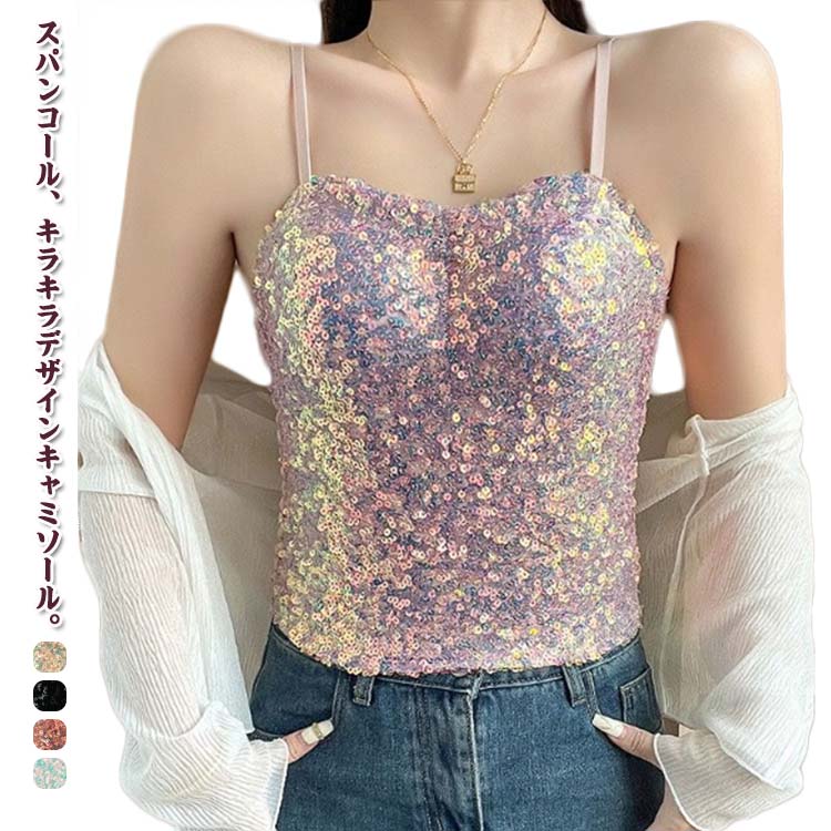 スパンコール キャミソール カップ付き ノンワイヤー カップ付きキャミソール 見せキャミ ノースリーブ トップス ダンス衣装 舞台衣装 ステージ衣装 キラキラ 春 夏 セクシー