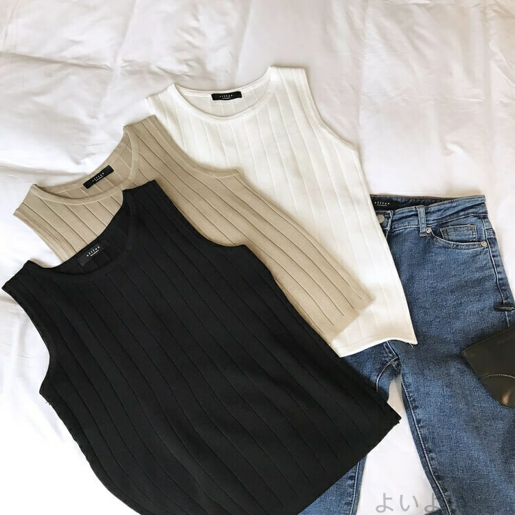 レディース 黒 韓国 ベージュ タンクトップ ブラック ニット ホワイト 太リブ クルーネック リブニット ブラッ 白