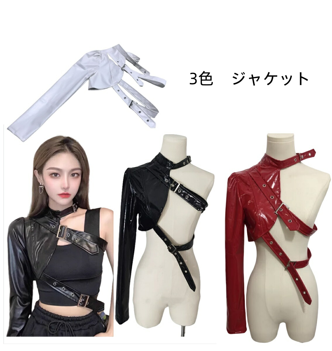 パンクジャケット レディース 舞台衣装 演出 フェイクレザー片腕 舞台向け ワンショルダー ジャズダンス 衣装 きらきら ステージ衣装 長袖 原宿系ホルターネック 上下セット 夜店 カラオ ショット丈