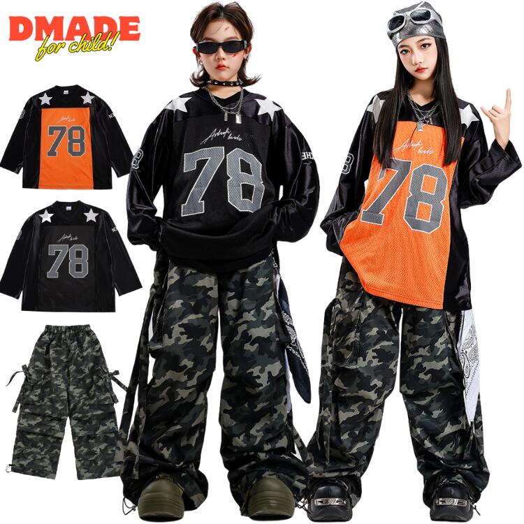 キッズ ダンス 衣装 オレンジ 迷彩 パンツ セットアップ ベースボールシャツ Tシャツ 長袖 男の子 女の子 ヒップホップ KPOP 韓国 練習着 発表会 チーム ストリート系