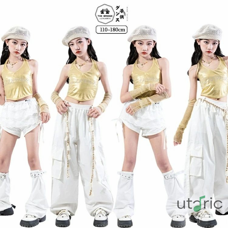 k-pop衣装 ダンス衣装 セットアップ ゴールド キラキラ 白 女の子 チョッキ カーゴパンツ ショートパンツ キッズ ダンス 衣装 団体服 ストリート系 ステージ衣装 ダンスウェア 発表会 演出服