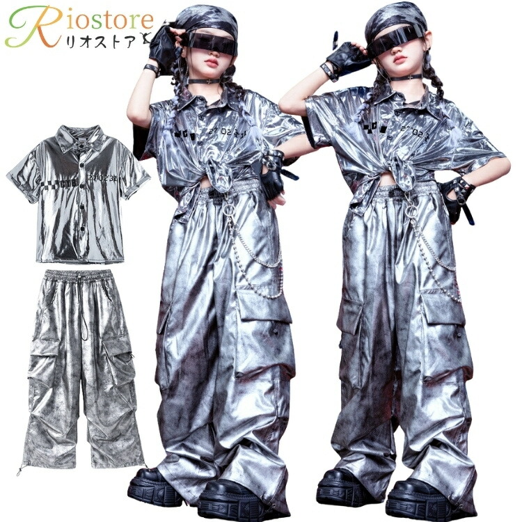キッズダンス 衣装 シルバー セットアップ HIPHOP タイダイ柄 Tシャツ カーゴパンツ 女の子 韓国 k-pop 発表会 派手 ダンス衣装 かっこいい 子供服 ダンスウェア ヒップ 練習着