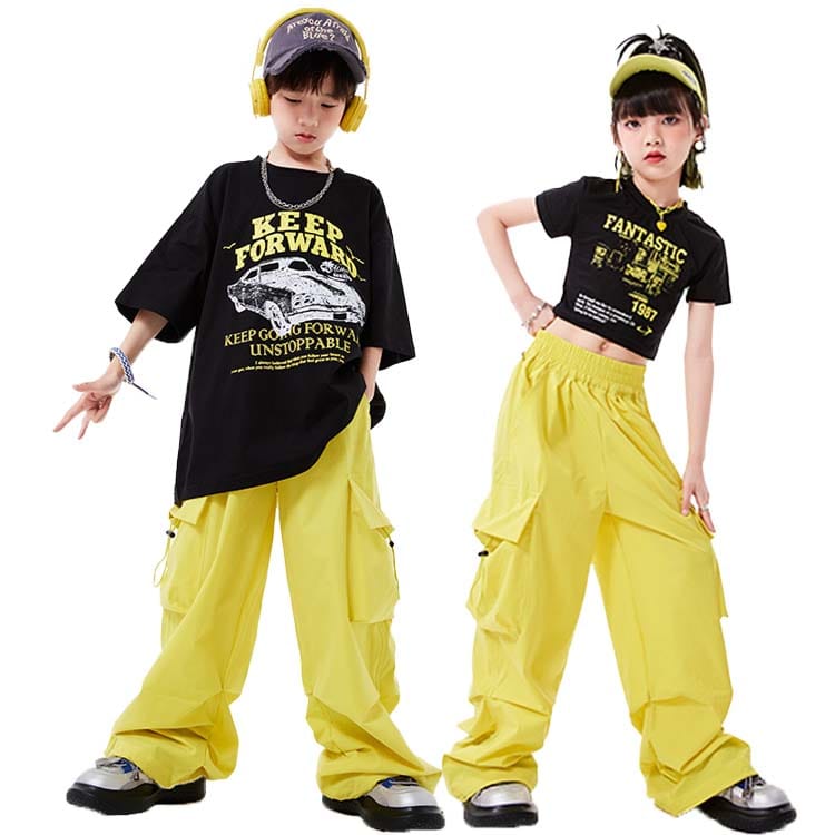 黄色 カーゴパンツ キッズダンス衣装 セットアップ ダンス ヒップホップ 子供服 男の子 女の子 tシャツ 黒 半袖 プリント 車 パンツ ロング丈 段袋 練習着 ダンス発表会 ポップ キッズダンス