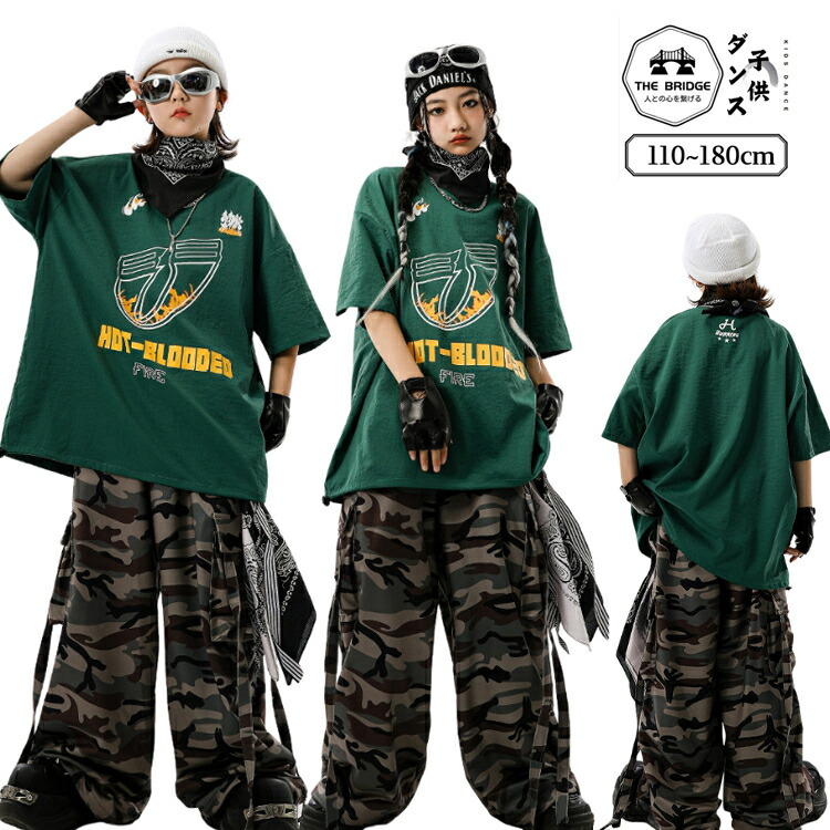 HIPHOP衣装 迷彩柄 キッズ ダンス衣装 演出服 緑 上下セット かっこいい 韓国風デザイン 子供服 おしゃれ 舞台服 女の子 男の子 ダンスウェア 炎柄 派手 jazz ヒップホップ